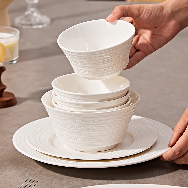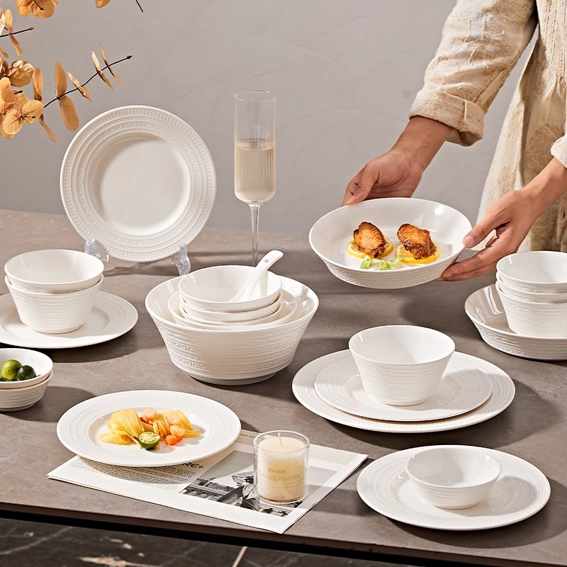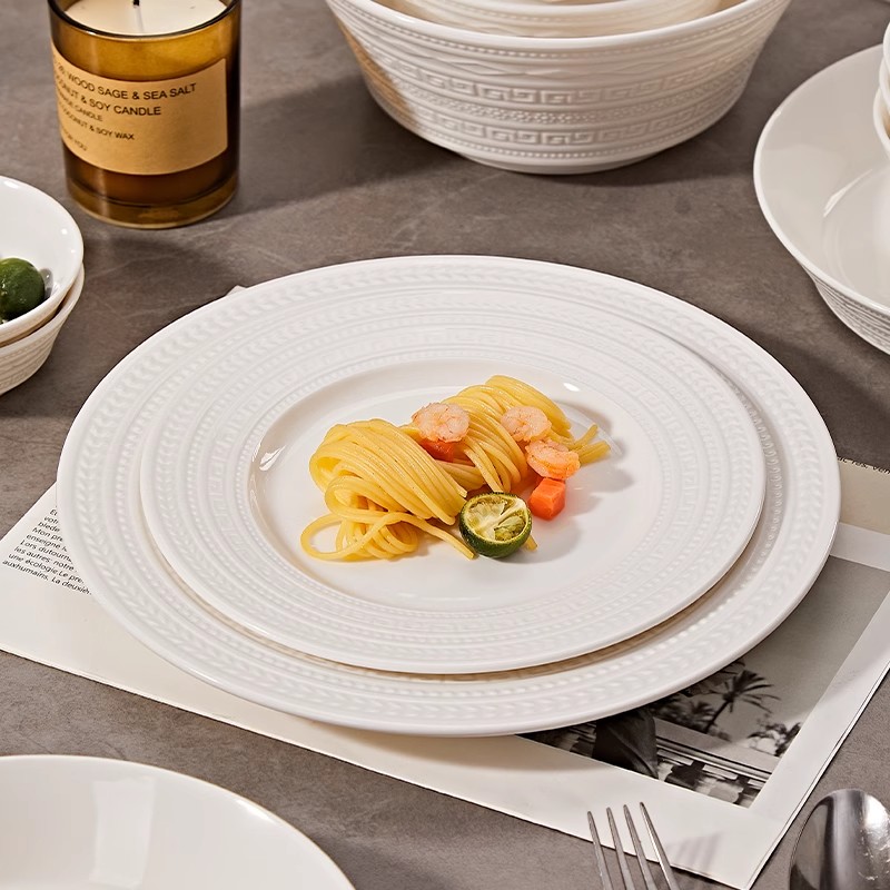 纯白浮雕碗家用2025新款法式陶瓷饭碗饭盘汤面碗餐具鱼盘西餐盘碗