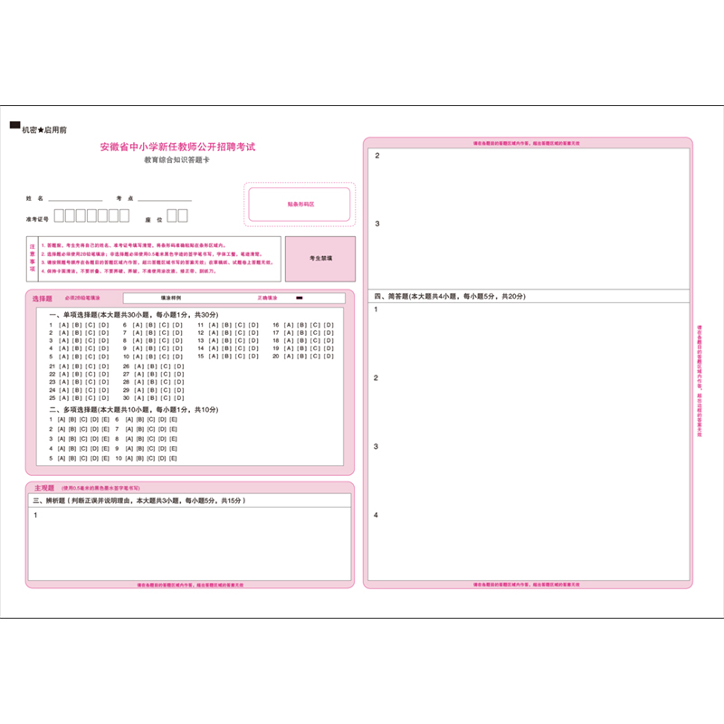 安徽省教师招聘考试教招教育综合知识答题卡模拟考试专用A3双面媲美考试纸张支持定制各类答题卡