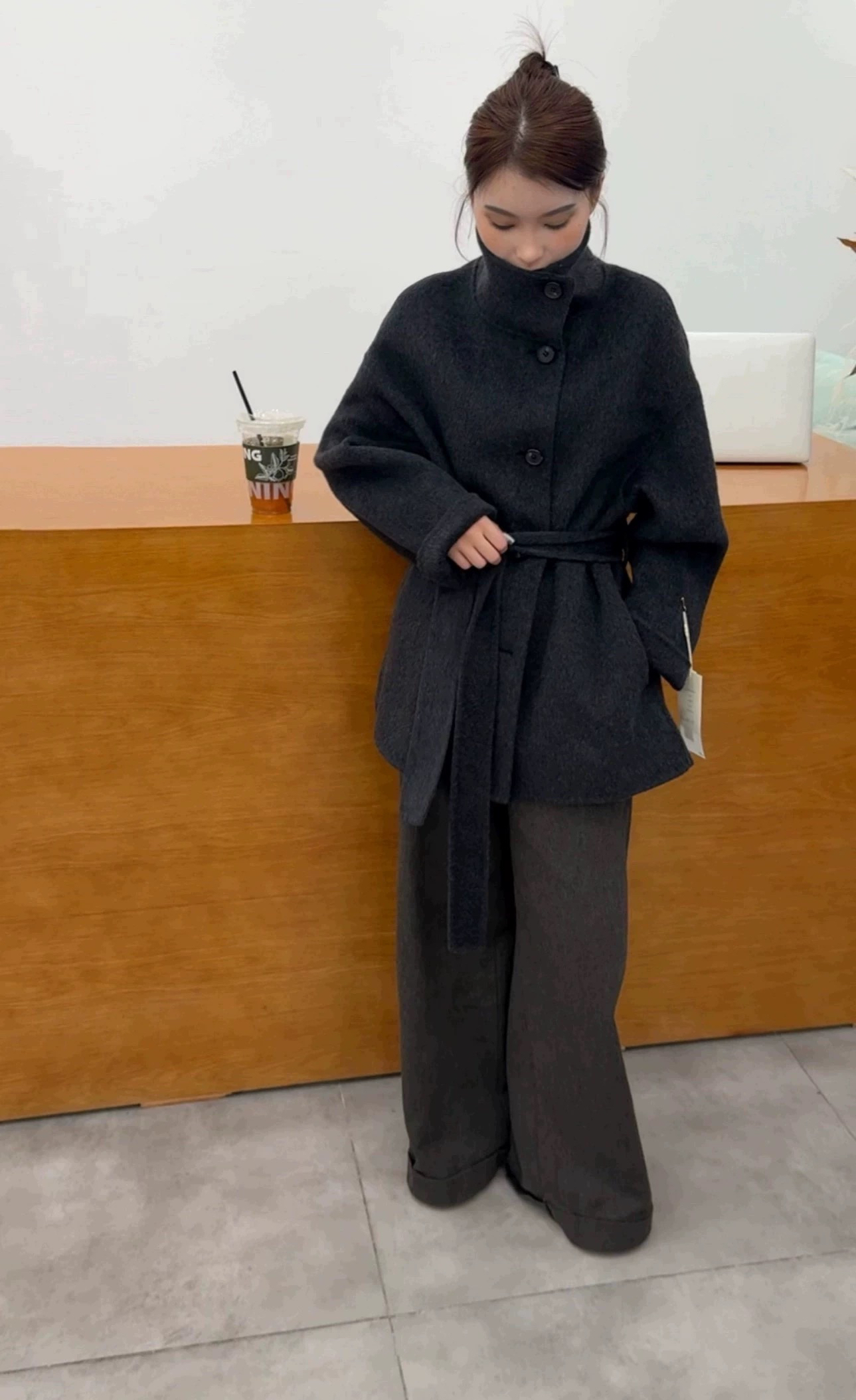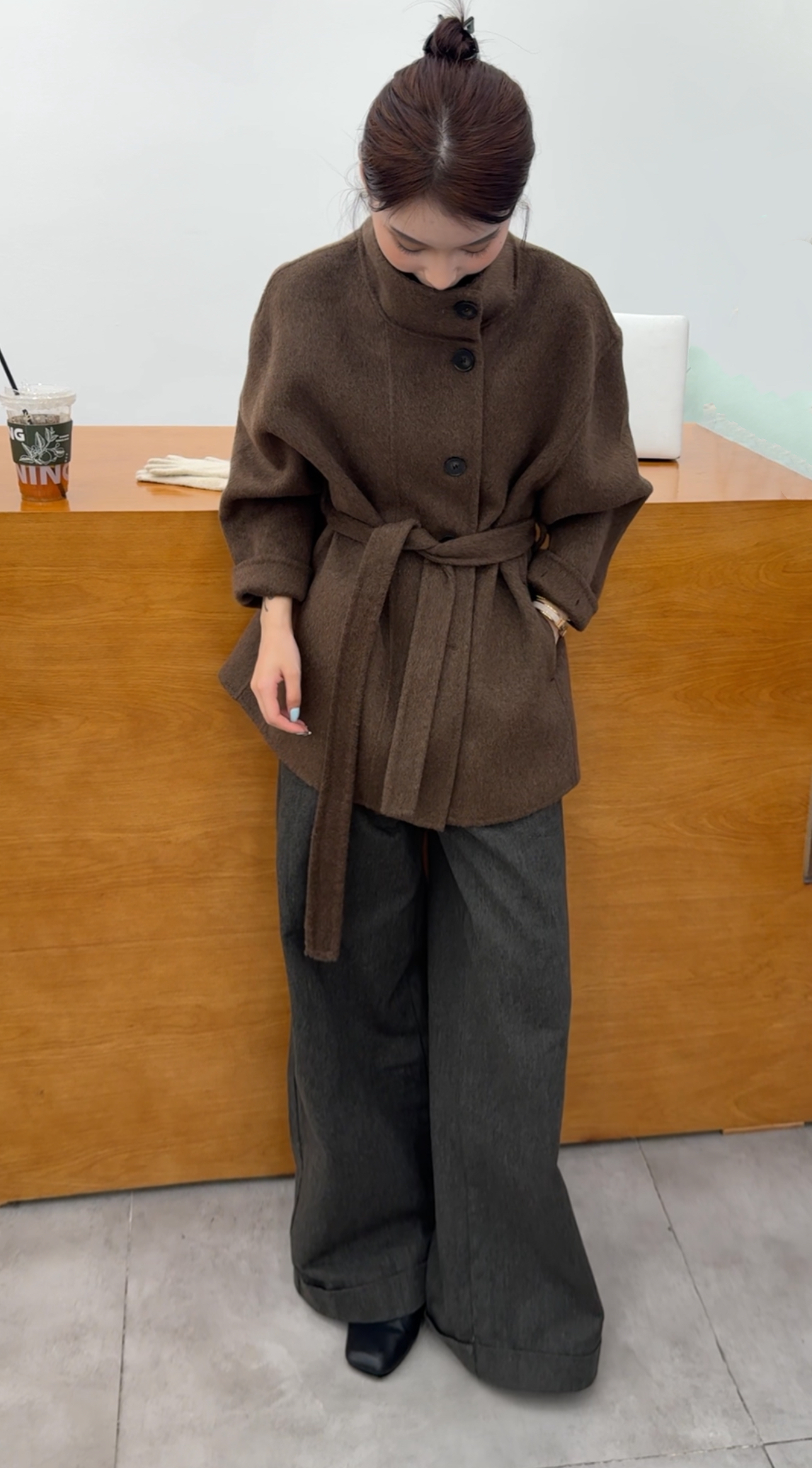 2025年秋季新款立领双面羊毛大衣女韩版A型系带裙摆羊毛呢外套短
