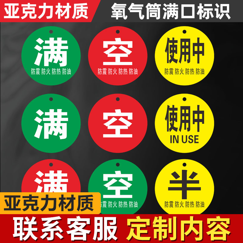 现货亚克力氧气筒标识牌空满半使用中挂牌防火防震防热防油护理警示牌气瓶状态标牌实验室四防吊牌支持定制