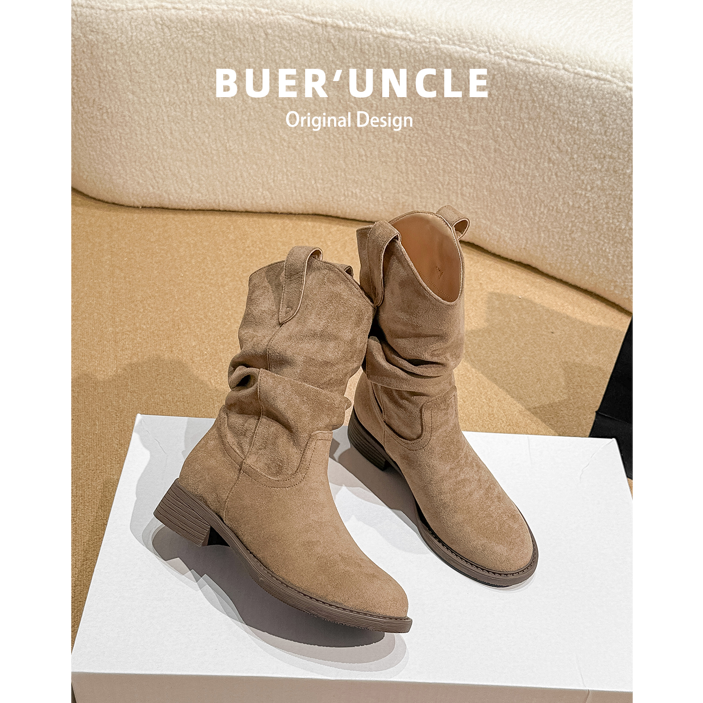真皮~内增高短靴女2025年秋季新款美拉德复古粗跟堆堆西部牛仔靴