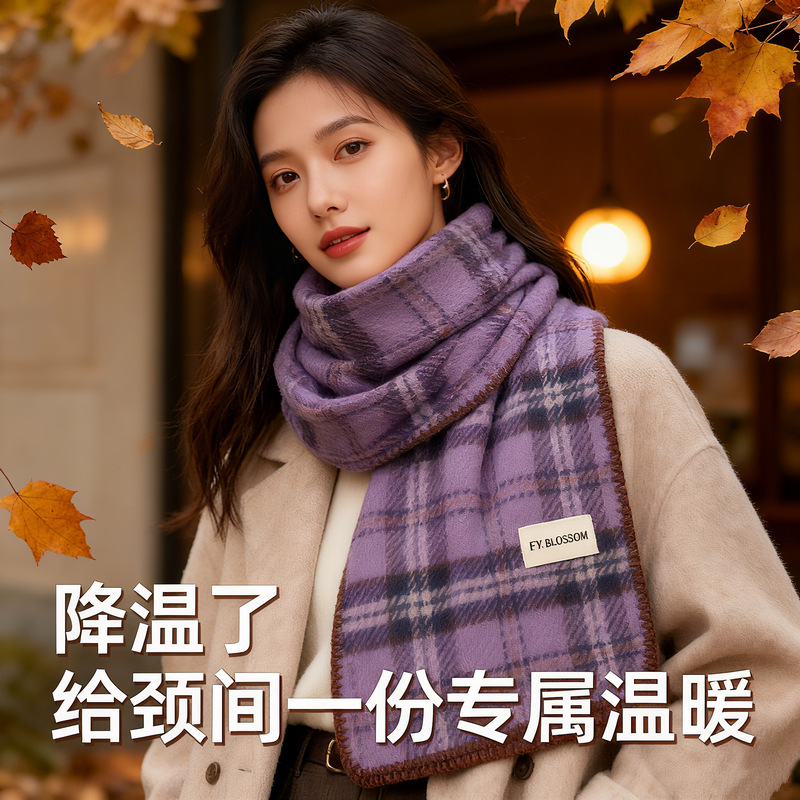 冬季女格子缝边双面围巾秋冬圣诞节红色学生情侣百搭披肩外贸围脖