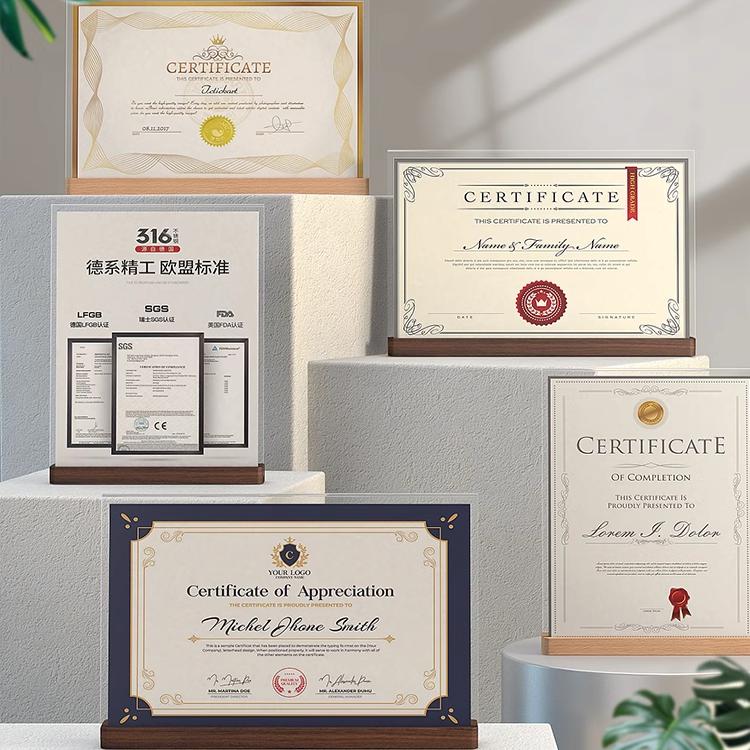 亚克力实木台卡桌面展示牌台签A4荣誉资质证书品牌专利授权书展示牌子A5教师学生奖状框展示立牌木质摆台定制