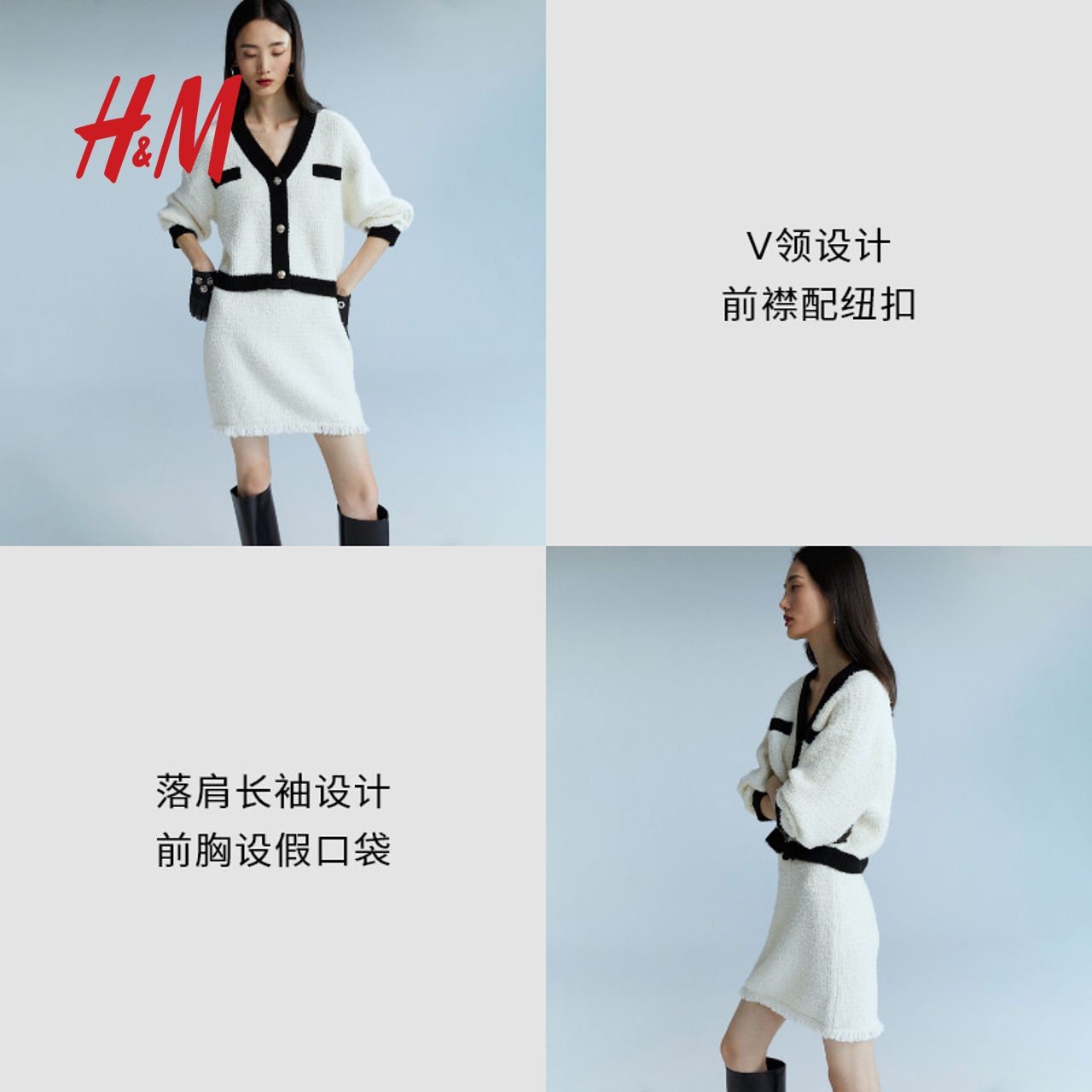 HM女装毛针织衫秋季V领纹理感针织短款千金小香风外套1223268