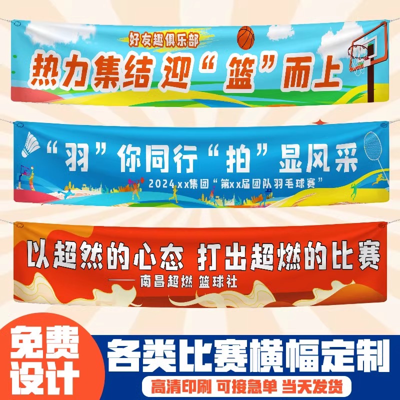 赛事横幅制作篮球比赛彩色条幅定制羽毛球比赛活动激励标语拉条设计足球俱乐部友谊对抗加油助威手拉旗子挂布