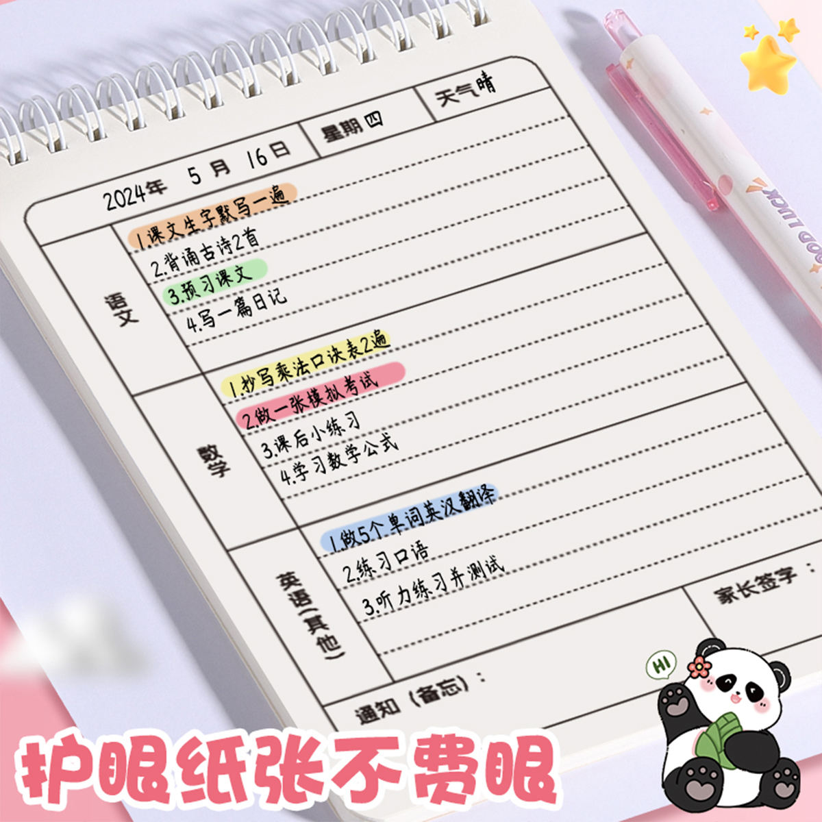 快乐熊猫作业登记本小学生用抄写课堂作业本高颜值卡通笔记本一二三年级随身口袋学生家校联系本子上翻线圈本
