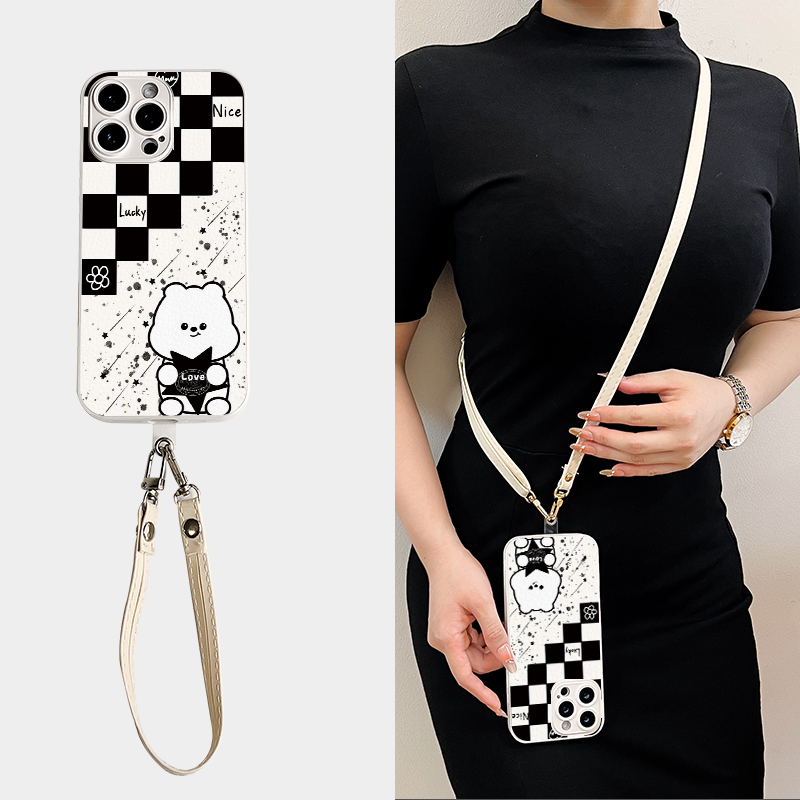 黑白小熊适用于苹果16promax斜挎iphone15手机壳14plus套13简约12Pro防摔11手提xs可调8挂绳xr女s16e级17时尚
