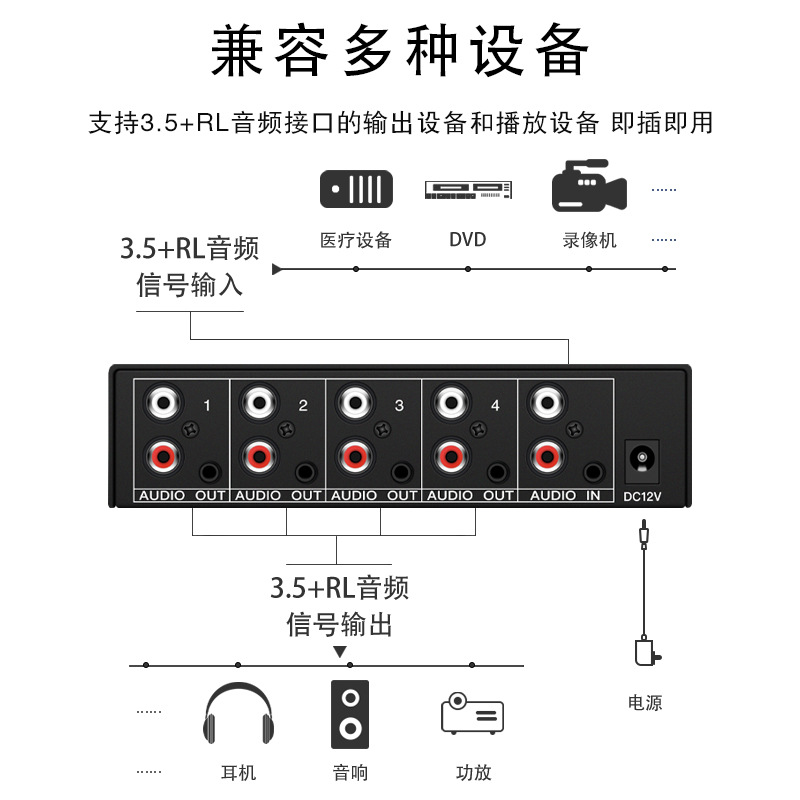 仝丽音频分配器一进四出4口立体声红白莲花音频3.5耳机音箱1进4出