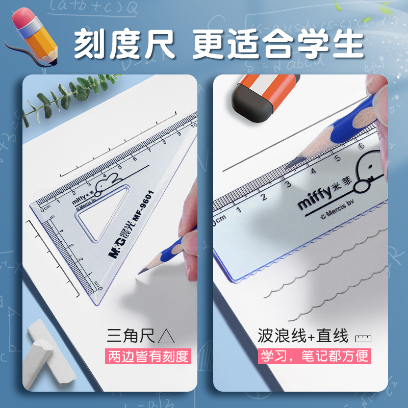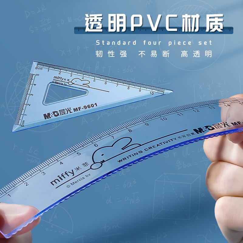晨光米菲套尺尺子三角尺小学生专用四件套一年级直尺量角器圆规套装儿童测量绘图透明15cm金属不锈钢尺文具