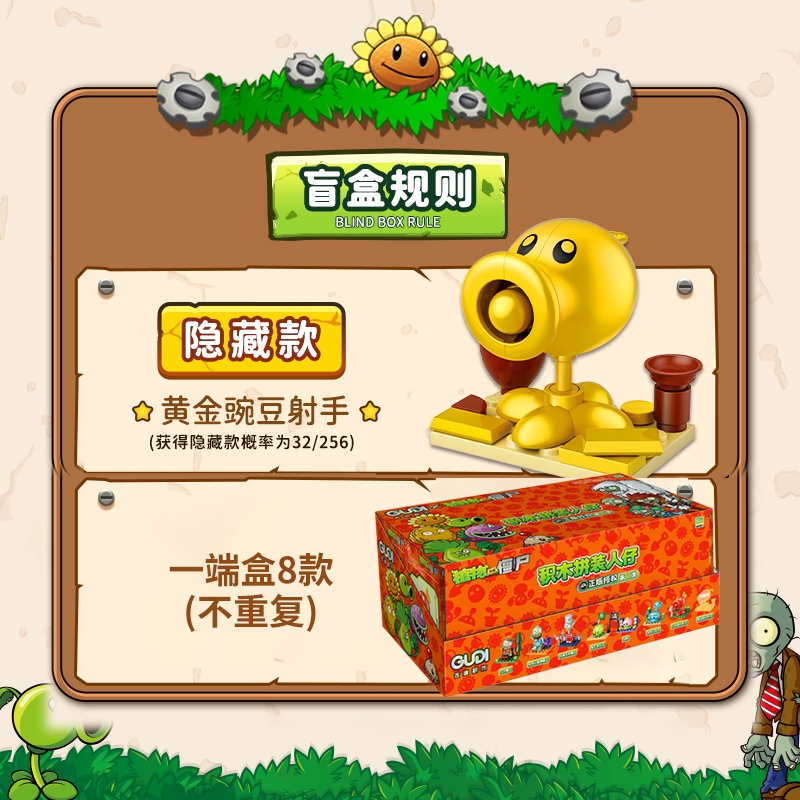 植物大战僵尸积木玩具盲盒金色豌豆隐藏款场景小颗粒礼物拼装火焰