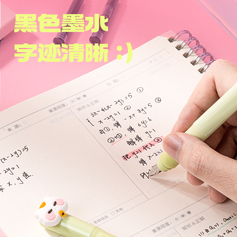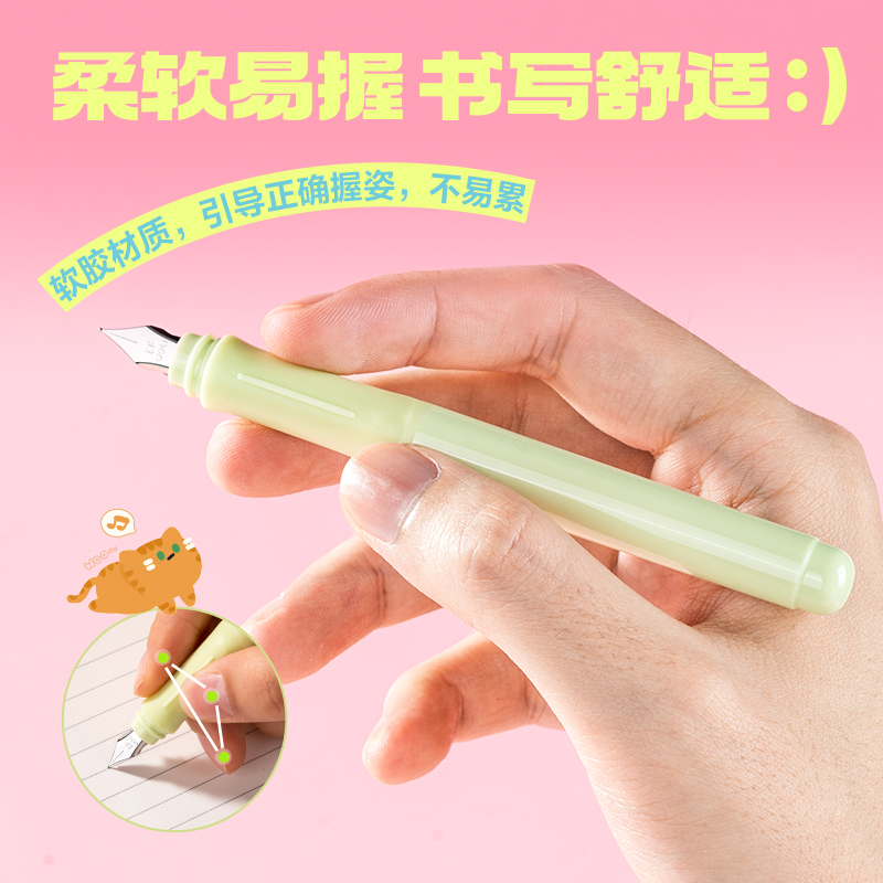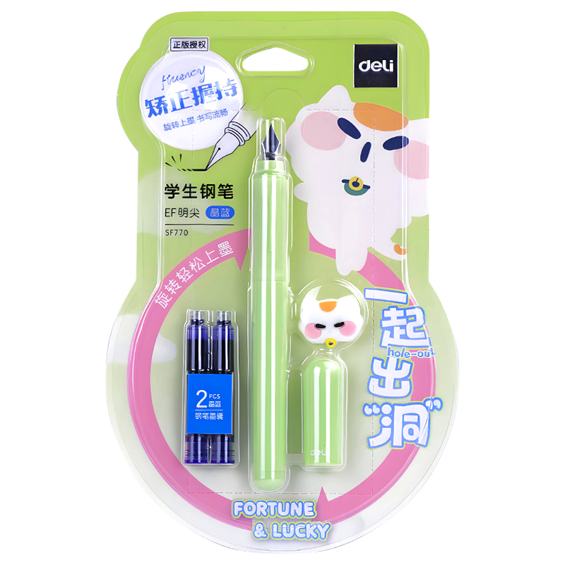 得力钢笔三顾喵庐学生专用EF明尖套装三年级高颜值矫正握姿可替换芯小学生四年级字帖练字六年级旋转上墨钢笔