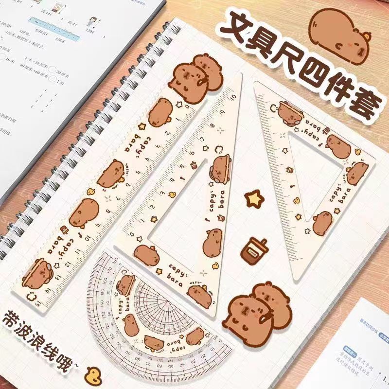 水豚卡皮巴拉尺子套装小学生专用套尺一年级二年级用品高颜值波浪尺15厘米直尺三角尺半圆幼儿园文具四件套