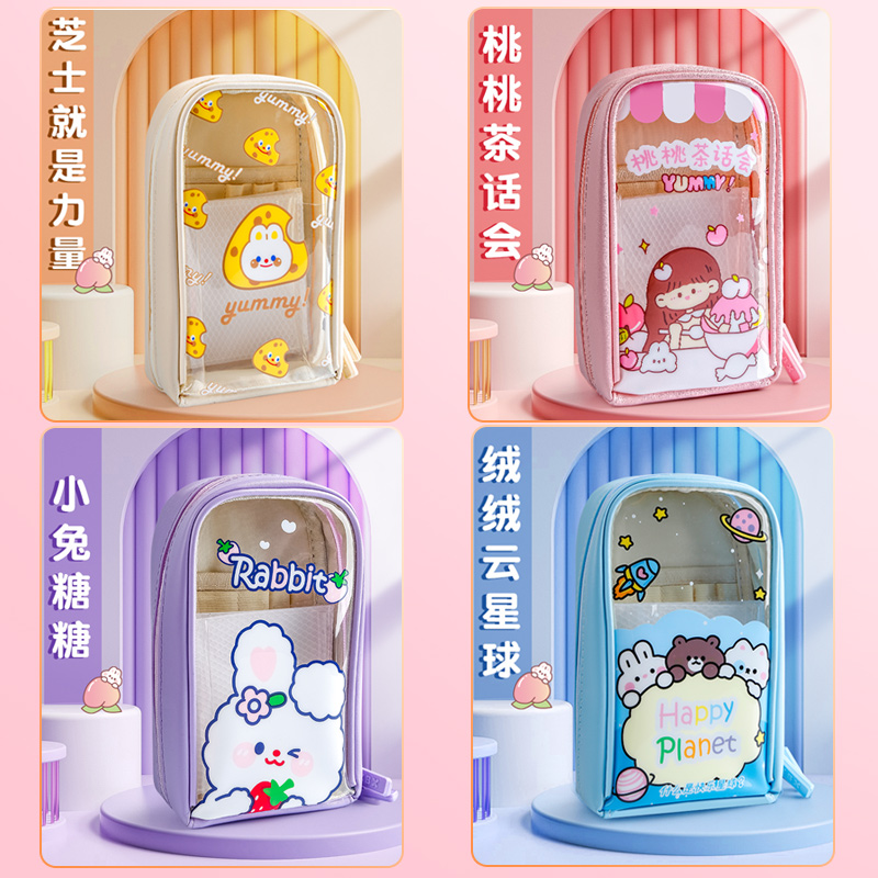 2022新款流行简约网红分层大容量笔袋小学生女孩手提竖款手帐专用收纳包透视文具盒ins日系初中高中生铅笔盒