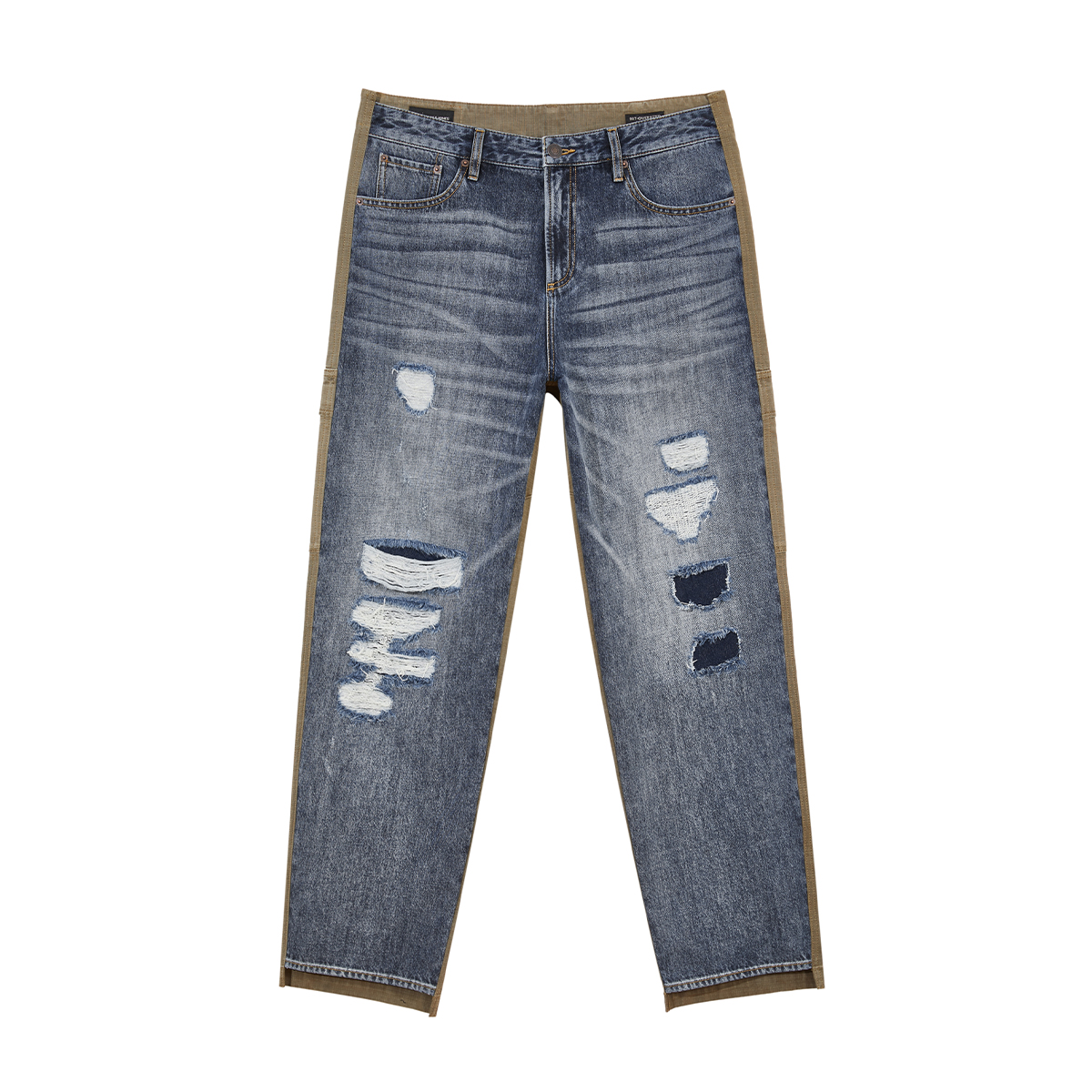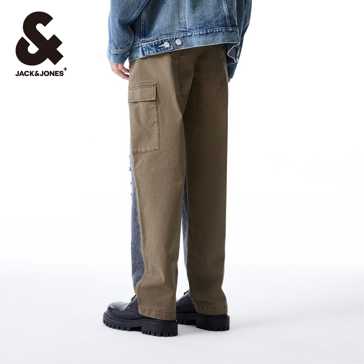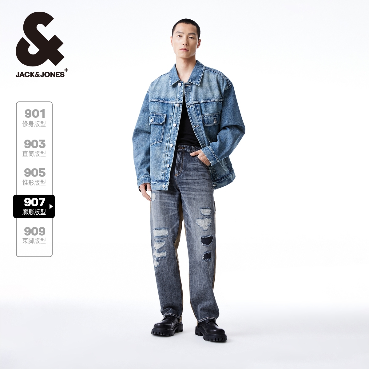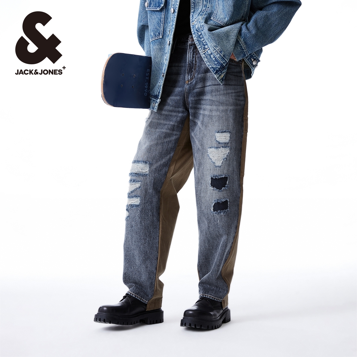 杰克琼斯男装牛仔裤子春2025阔腿裤水洗撞色拼接不规则宽松