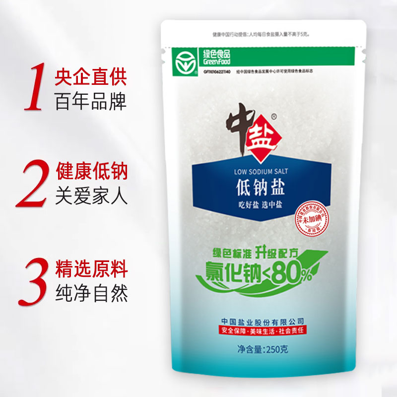 中盐未加碘绿色低钠盐250g/袋家用食用盐低钠钾盐食盐无碘盐国家