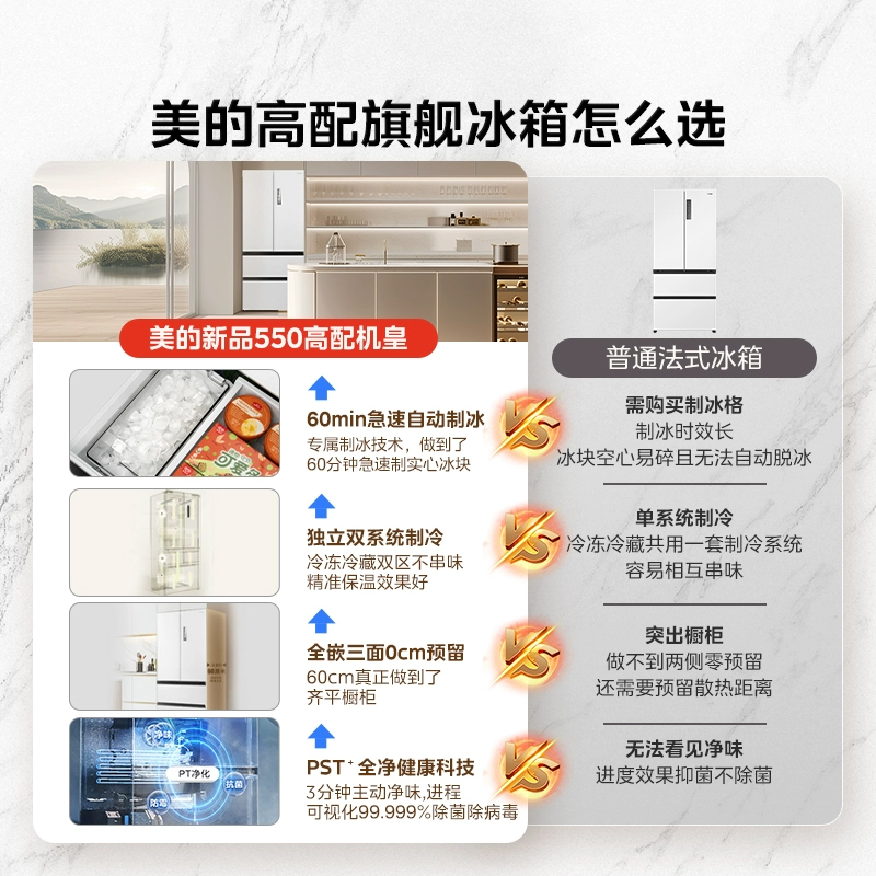 【双系统】美的机皇550超薄零嵌冰箱家用自动制冰法式双开门无霜