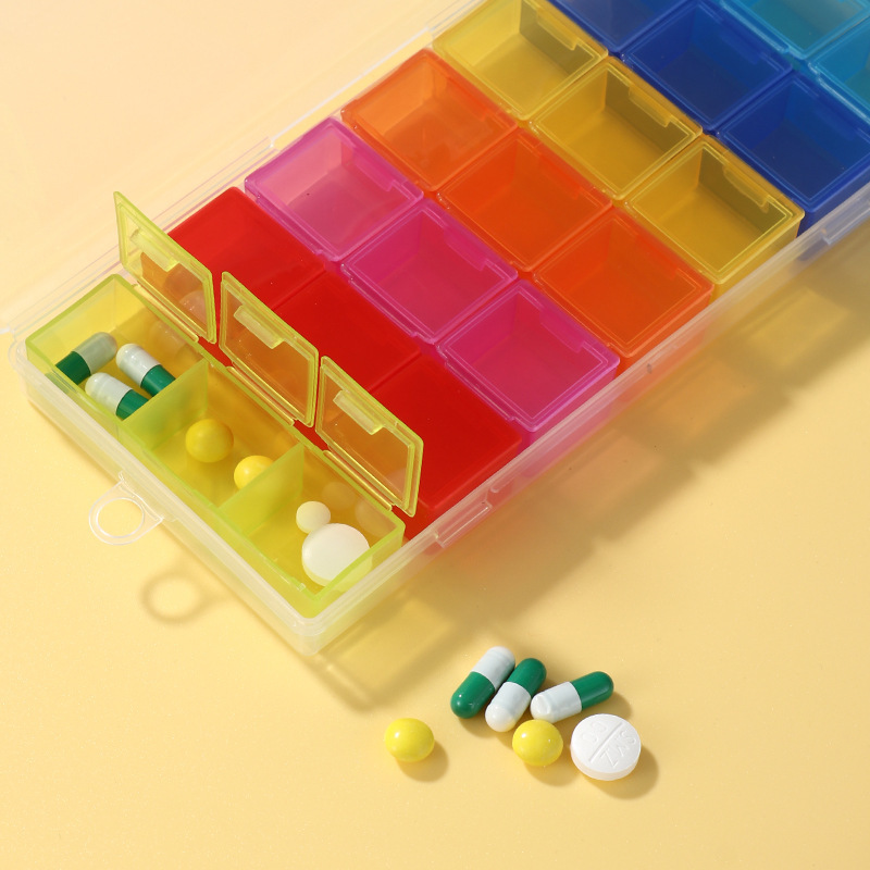 翻盖式七彩分格收纳盒便捷式独立21小分格塑料药盒小物件收纳盒子