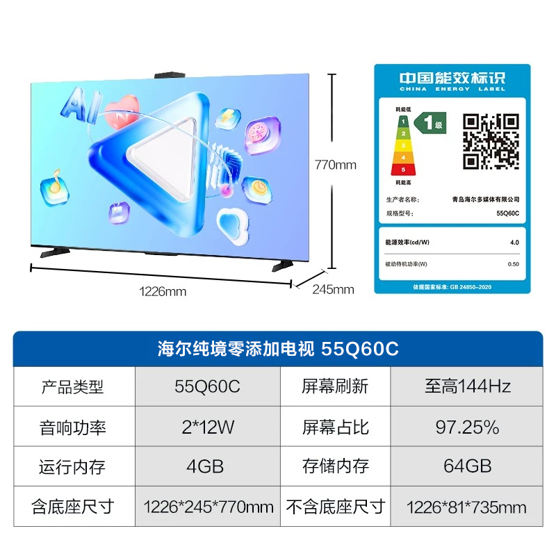 海尔纯境零添加电视 55Q60C 55英寸老人打开就能看的电视液晶家用