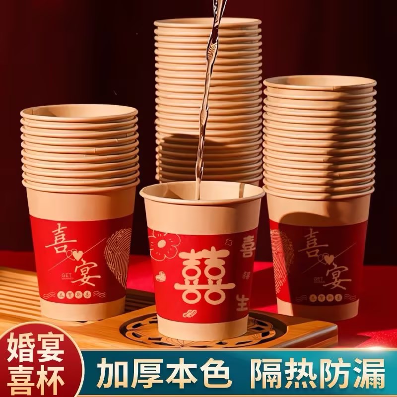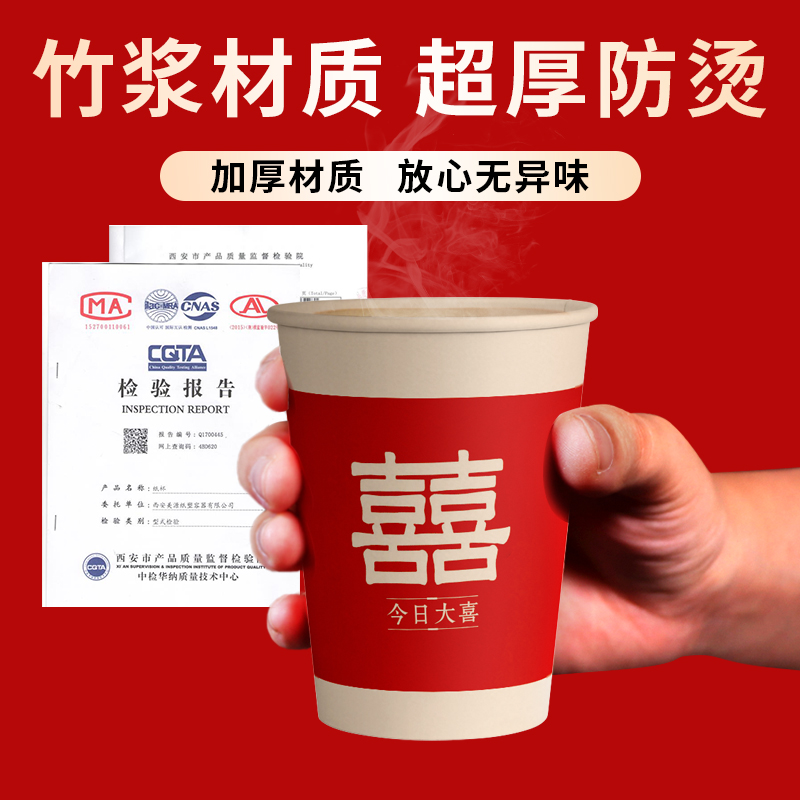 一次性结婚纸杯家用婚礼酒席喝水敬茶杯加厚餐具婚庆用品红色喜庆