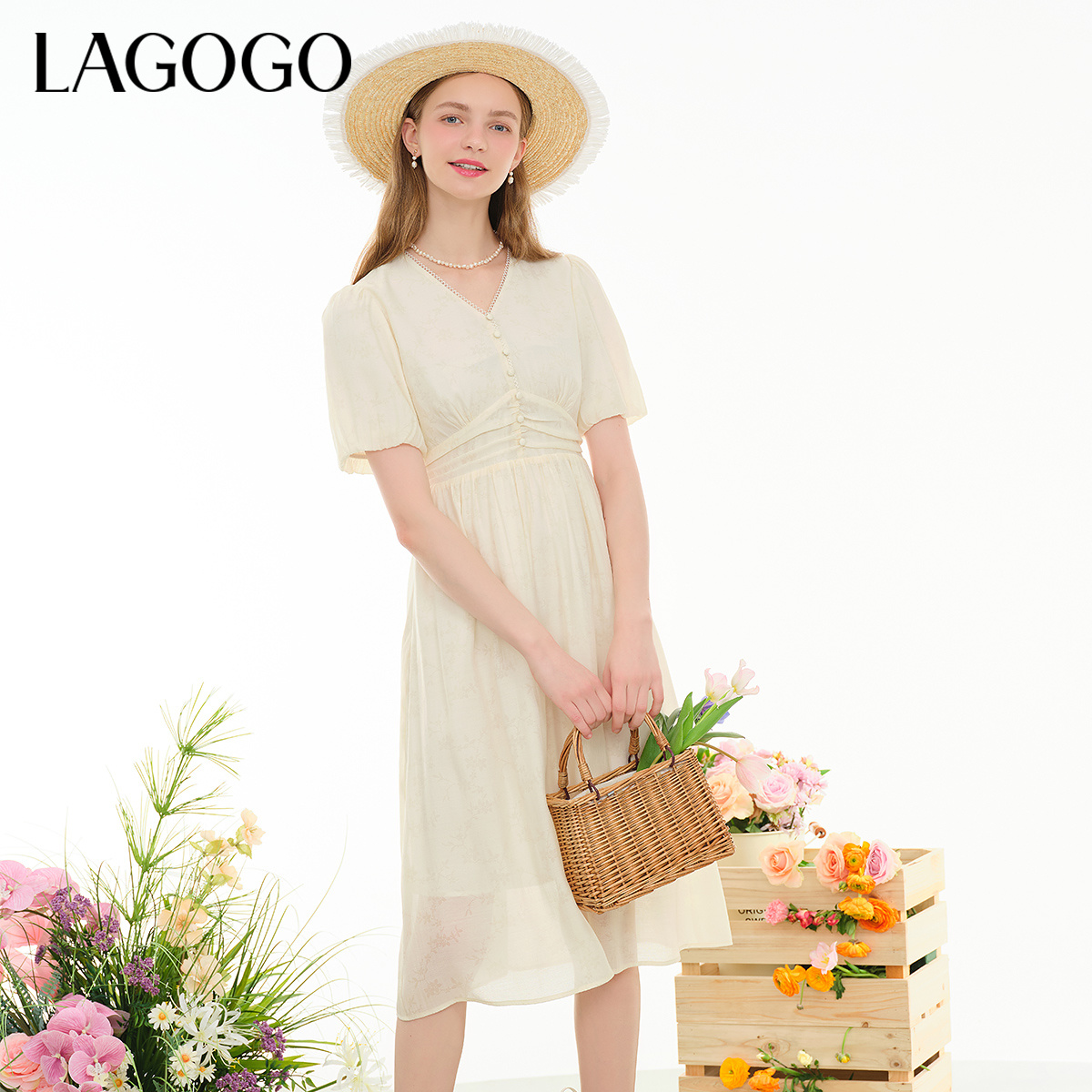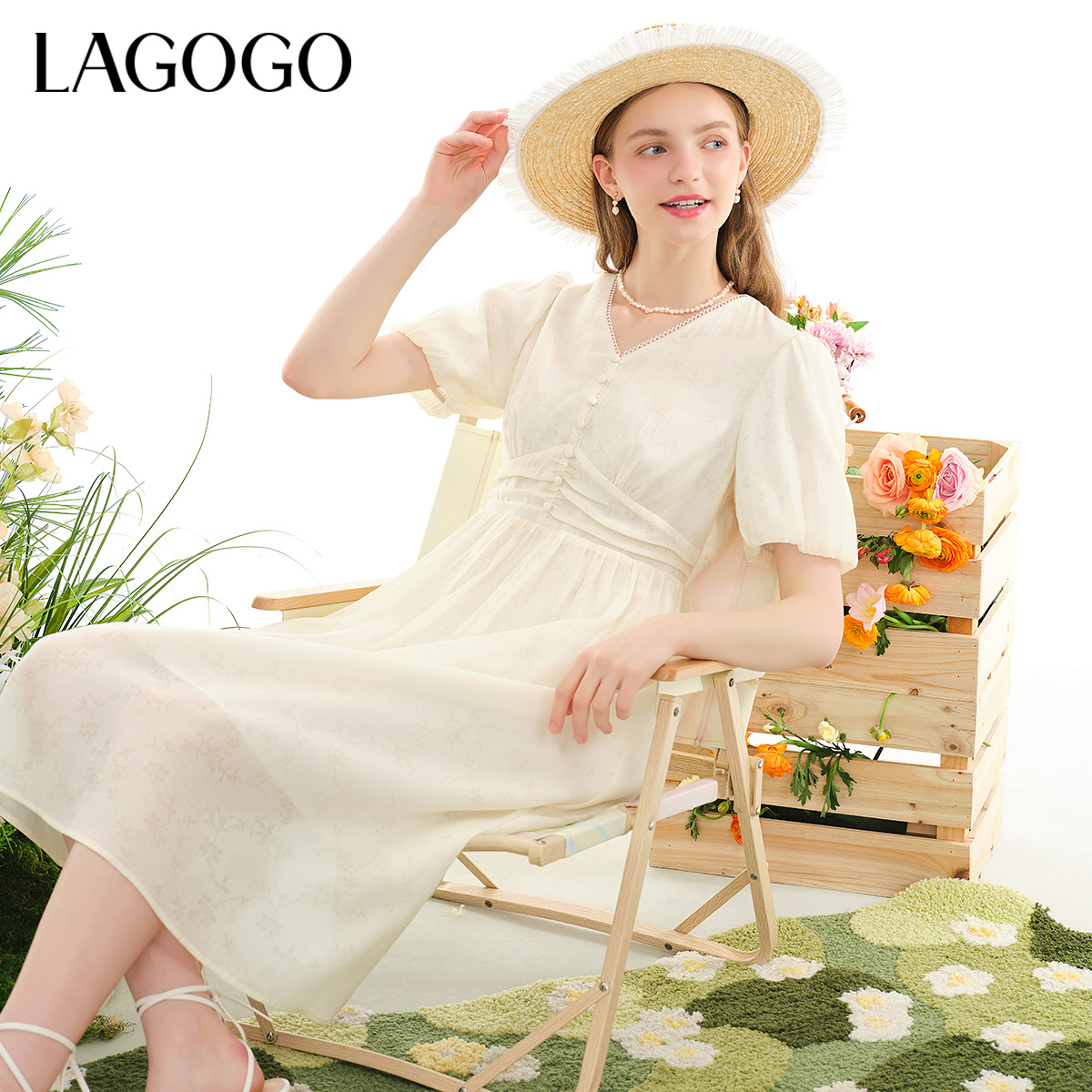 Lagogo拉谷谷温柔风白色绣花连衣裙女2024夏新款气质泡泡袖仙女裙
