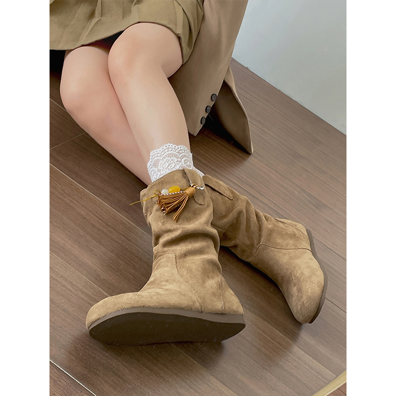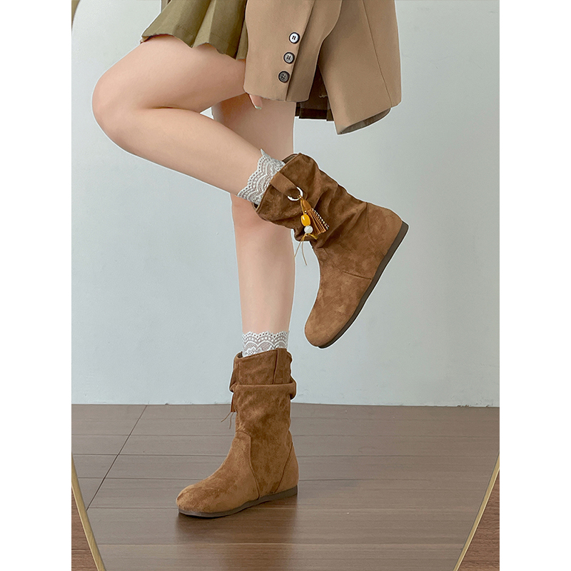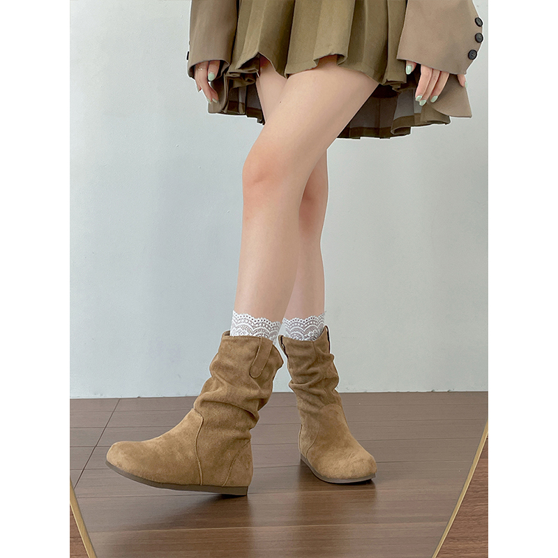 羊皮版!西部褶皱短靴女堆堆靴复古英伦风小个子内增高中筒马丁靴