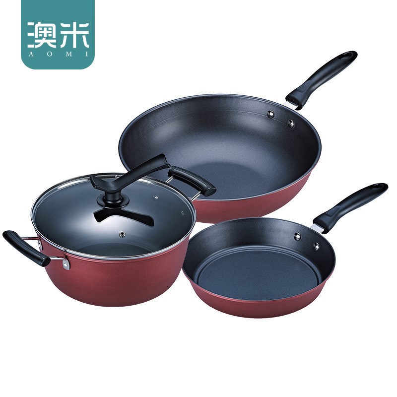 中国红三件套锅 炫彩不粘锅礼品套装汤锅炒锅平底锅厨房多用能锅