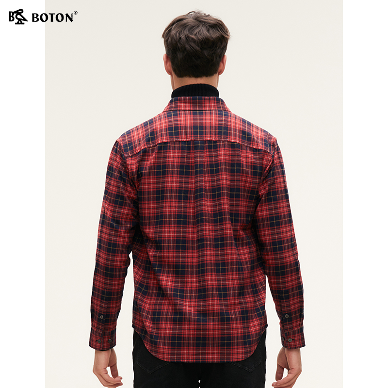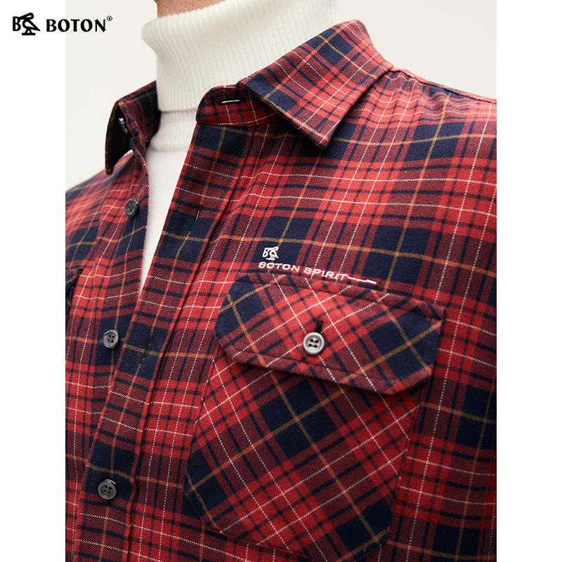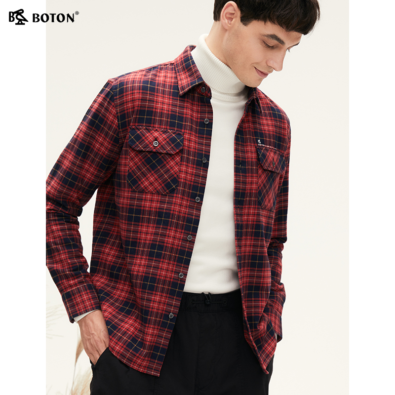 波顿2025秋冬新款男士红蓝色长袖格子衬衫高端休闲美式英伦风衬衣