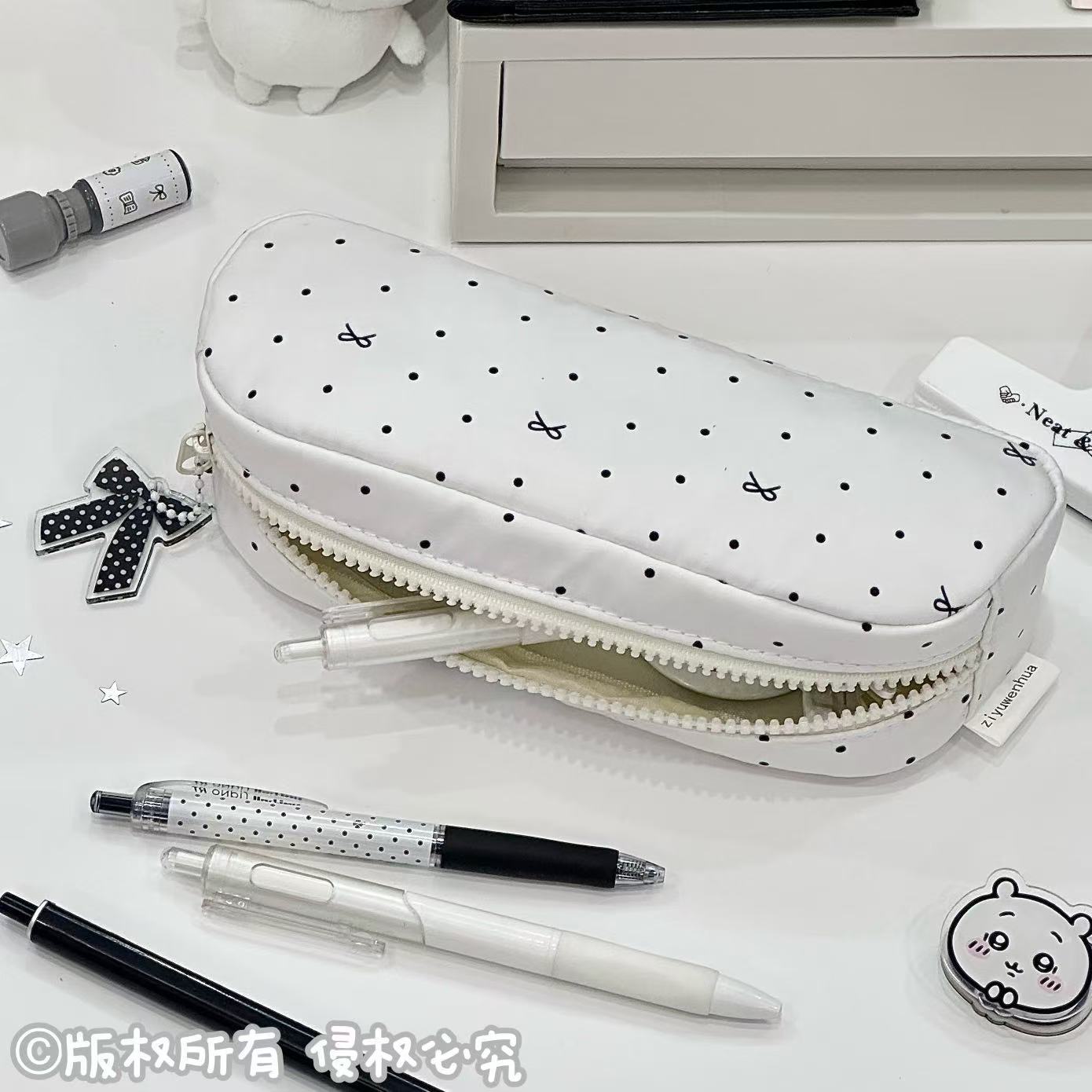 原创奶白波点蝴蝶结面包笔袋ins风少女心高颜值大容量文具收纳袋