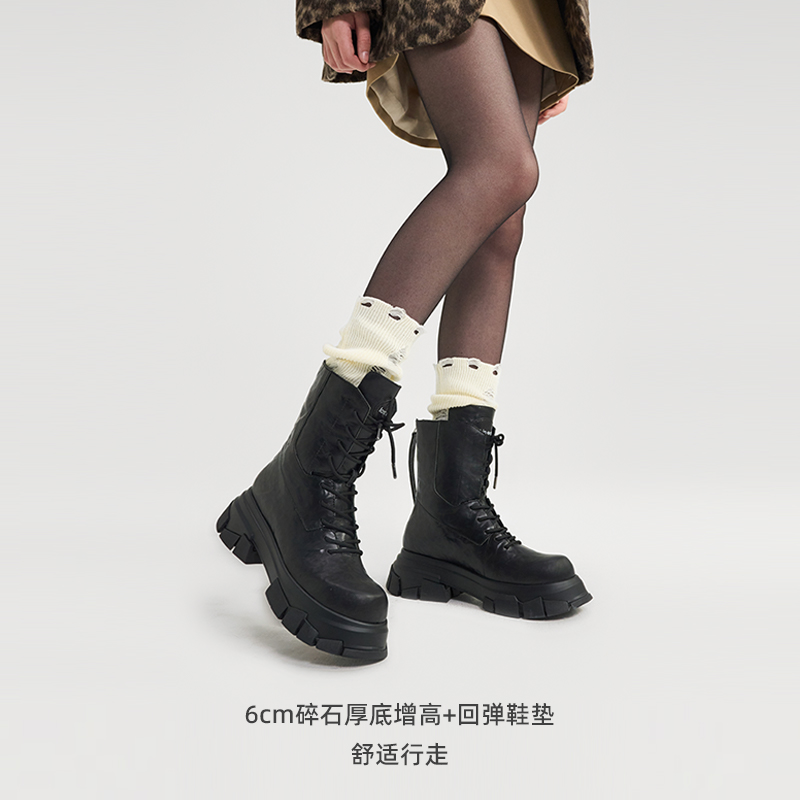 千百度英伦风马丁靴女款2025秋季新款内增高拳击靴复古小众西部靴