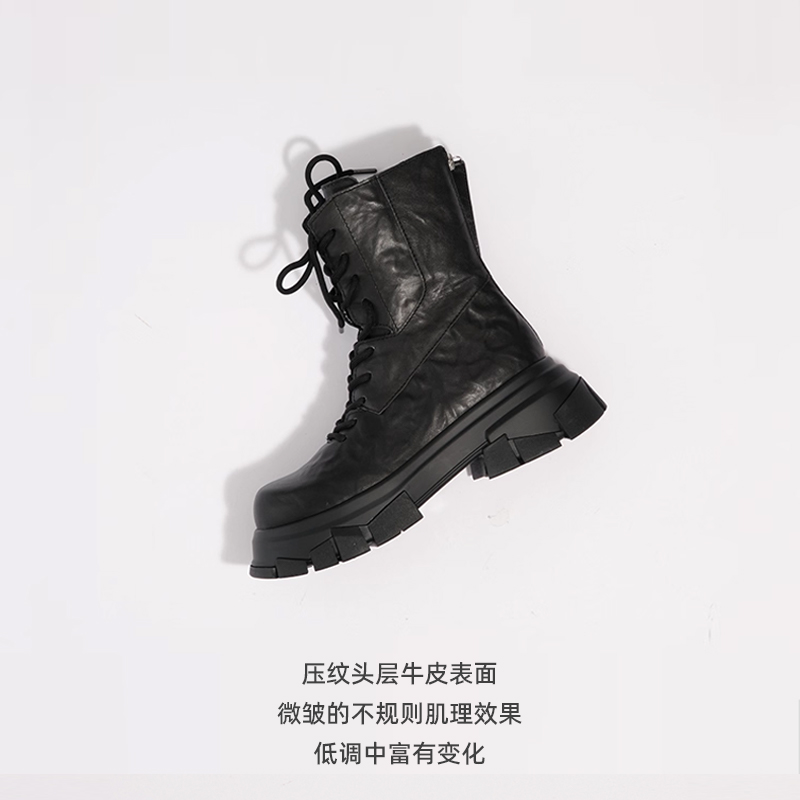 马丁靴女真皮大头前拉链翻领两穿厚底松糕小个子机车骑士瘦瘦长靴