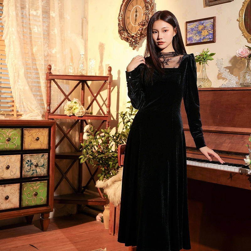 记忆的起点长袖丝绒连衣裙2024冬季新款气质时尚长裙子68GD81228W
