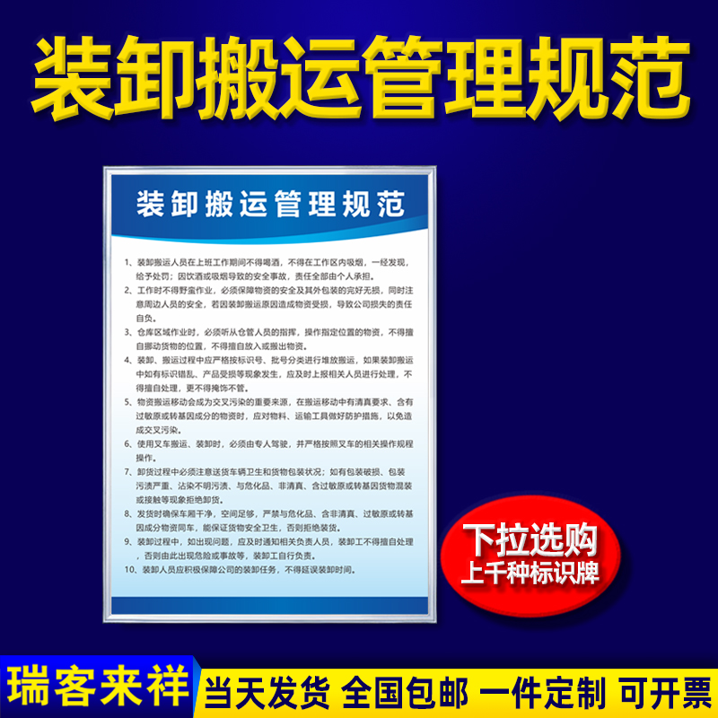 装卸搬运管理规范消防标识牌企业公司仓库车间制度牌上墙操作规程规章制度牌框挂墙仓储员工励志文化标语定制