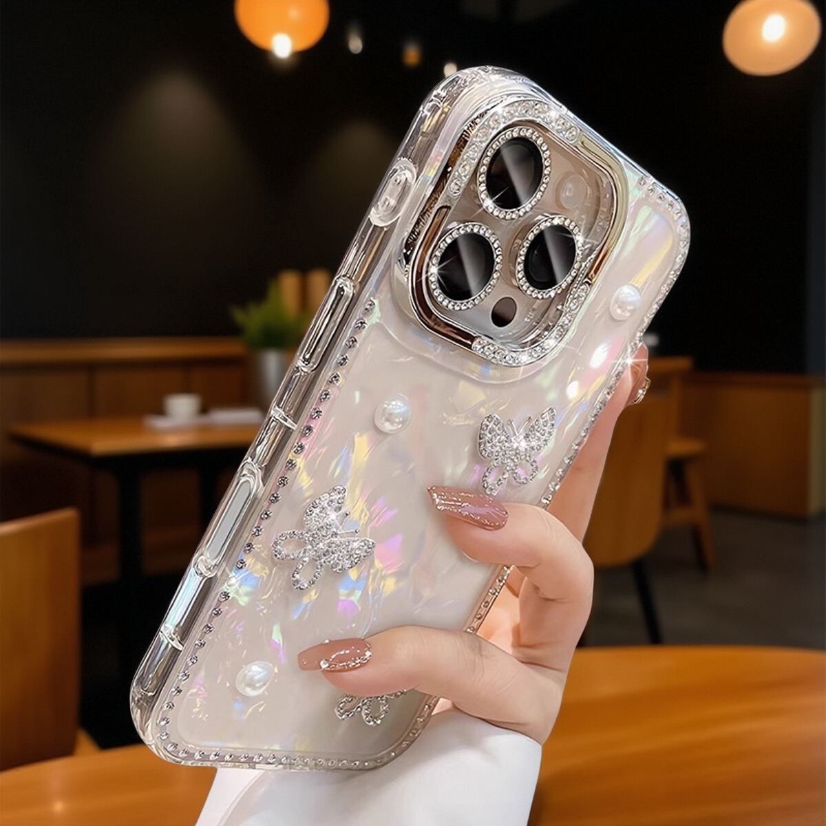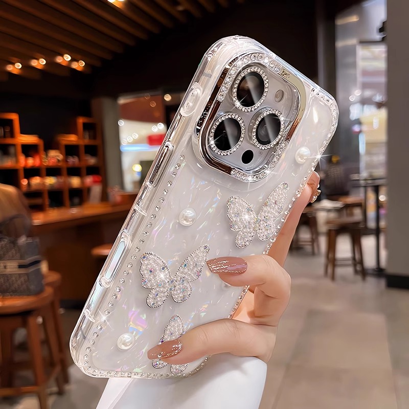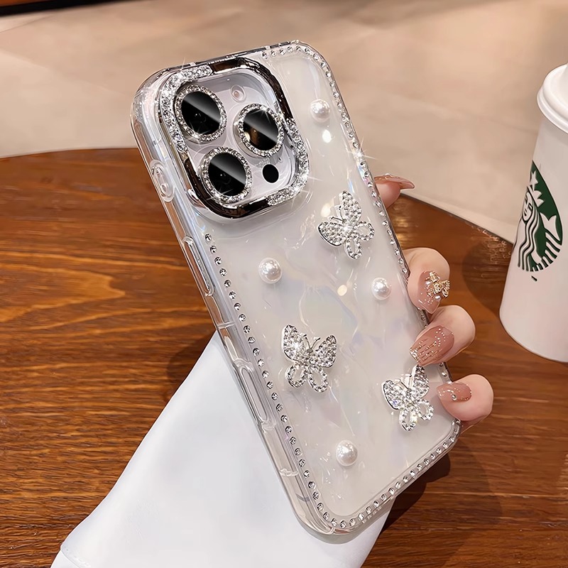 适用苹果16promax手机壳iphone15新款水钻镜头膜14pm立体珍珠蝴蝶贝壳纹13气囊防摔12带手链全包高级感女神套