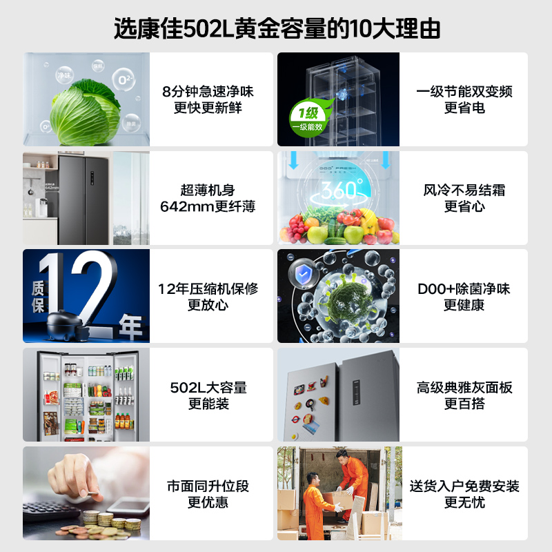 康佳502L对开双开门冰箱一级节能变频风冷家用大容量以旧换新补贴