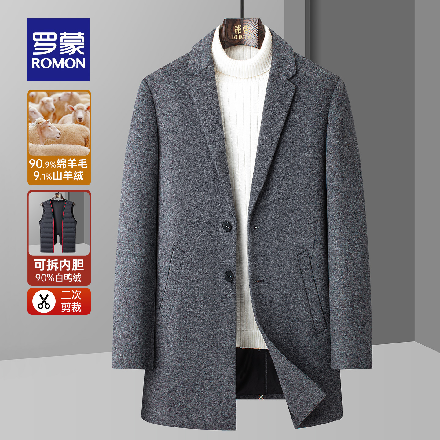【一衣三穿+含羊毛/绒】罗蒙2025秋冬新款可拆羽绒内胆保暖呢大衣