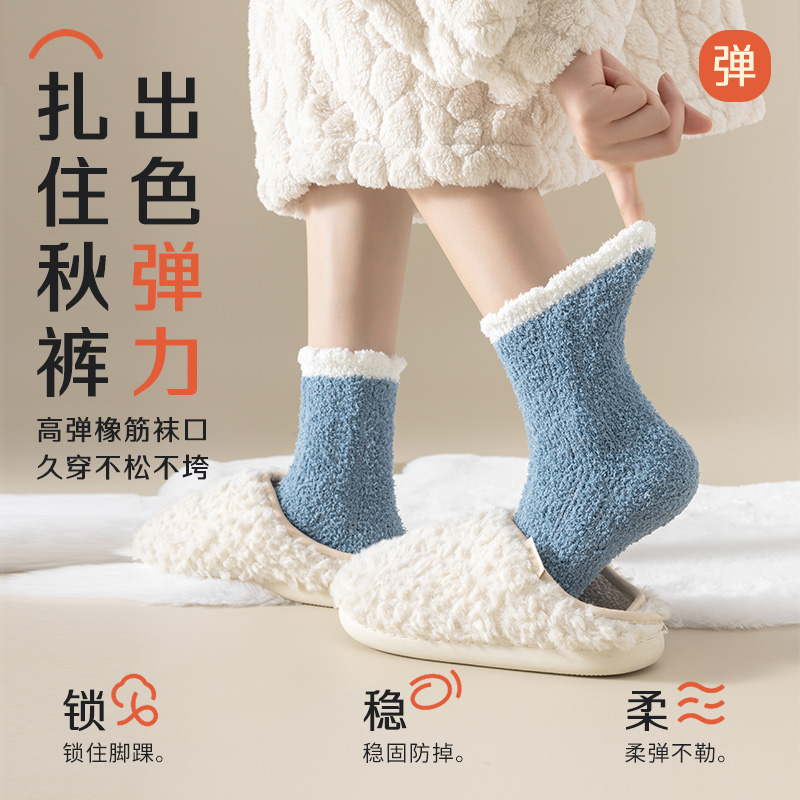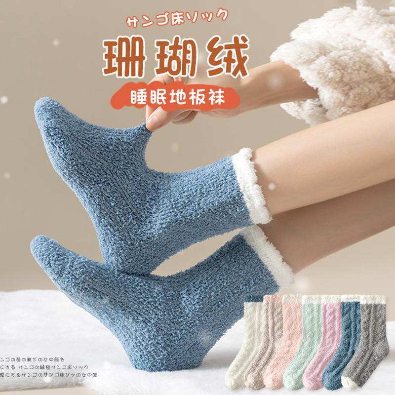 珊瑚绒袜子女秋冬季加绒加厚中筒保暖冬天睡觉居家毛巾地板袜睡眠