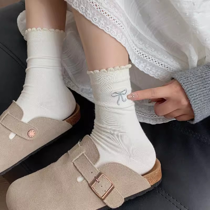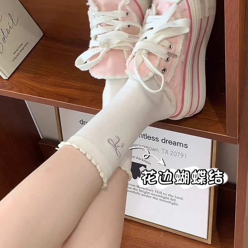 miu系灰色花边蝴蝶结袜子女春秋中筒袜韩系少女显瘦ins纯棉堆堆袜