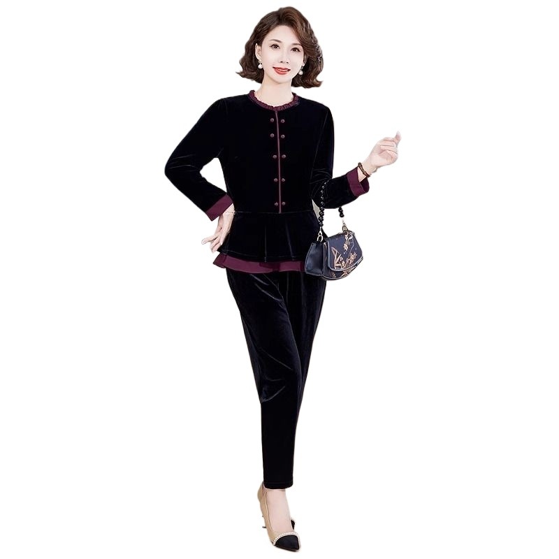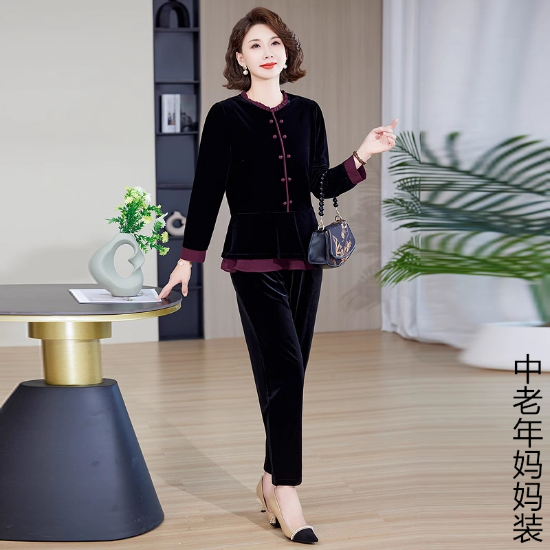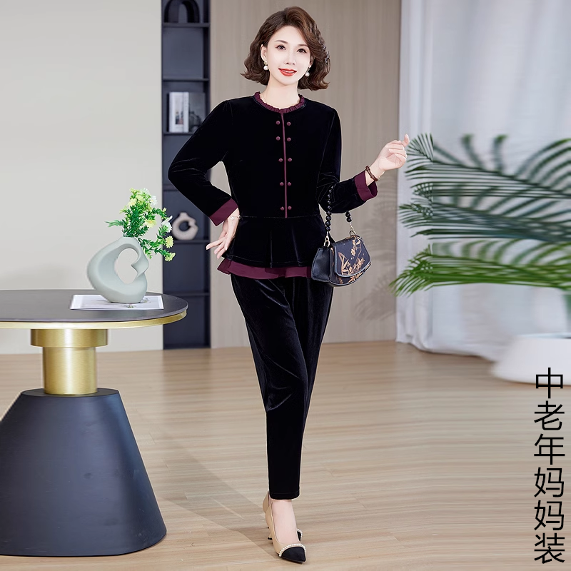洋气胖妈妈春装金丝绒套装200斤中老年女春秋气质加肥大码两件套