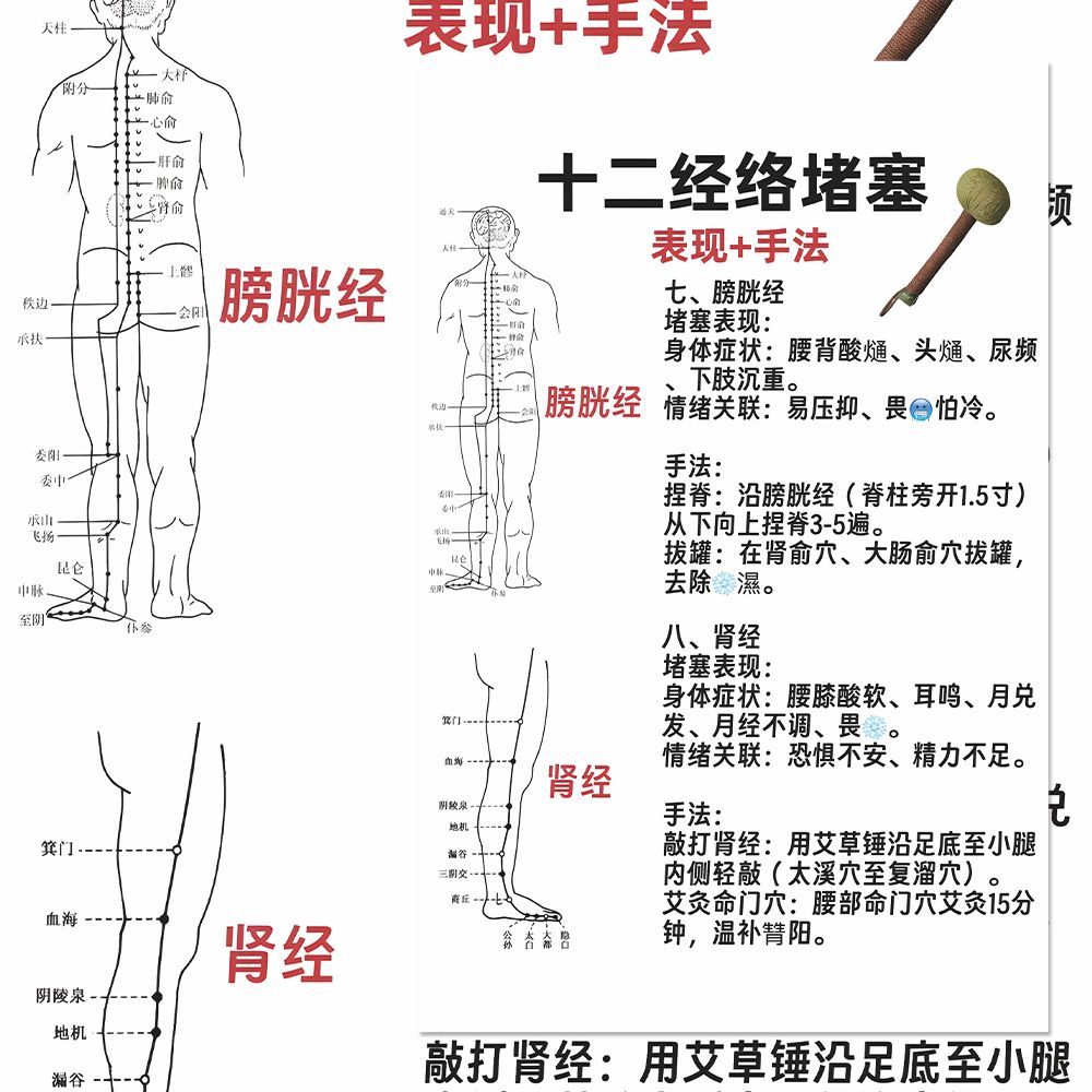超大18张中医养生12经络堵塞表现+梳通方法贴纸十二经脉循行贴画