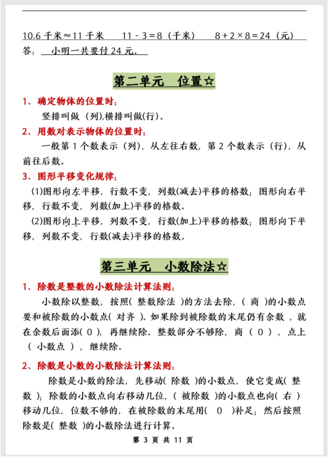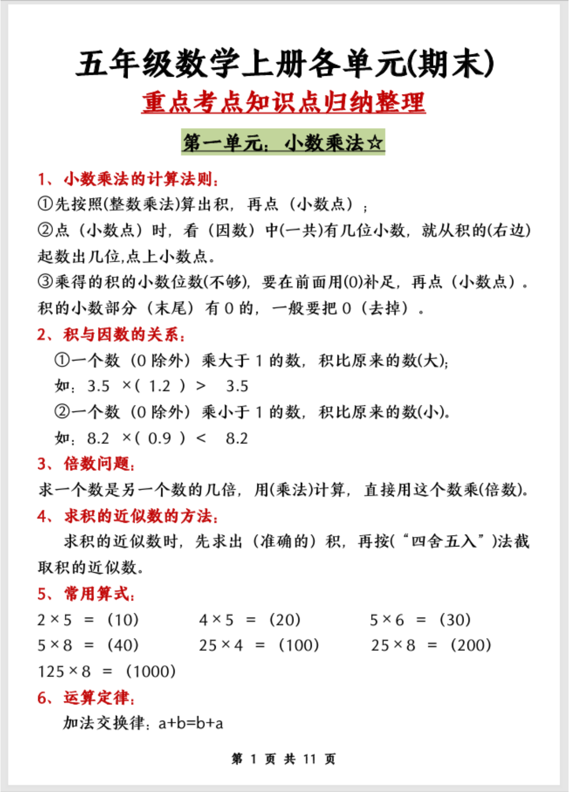 人教版小学五年级数学上册重点考点知识归纳各单元期末其中考的整理