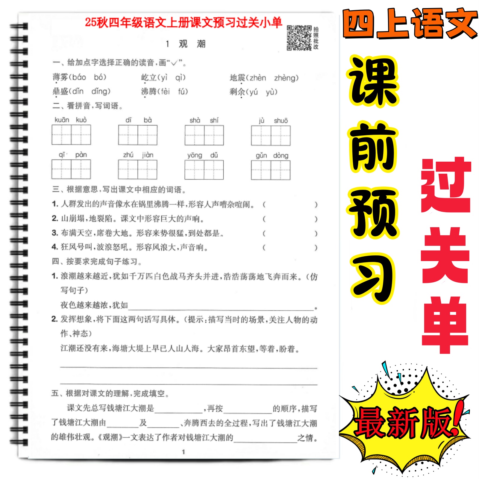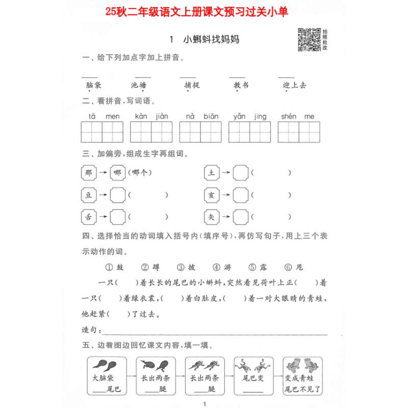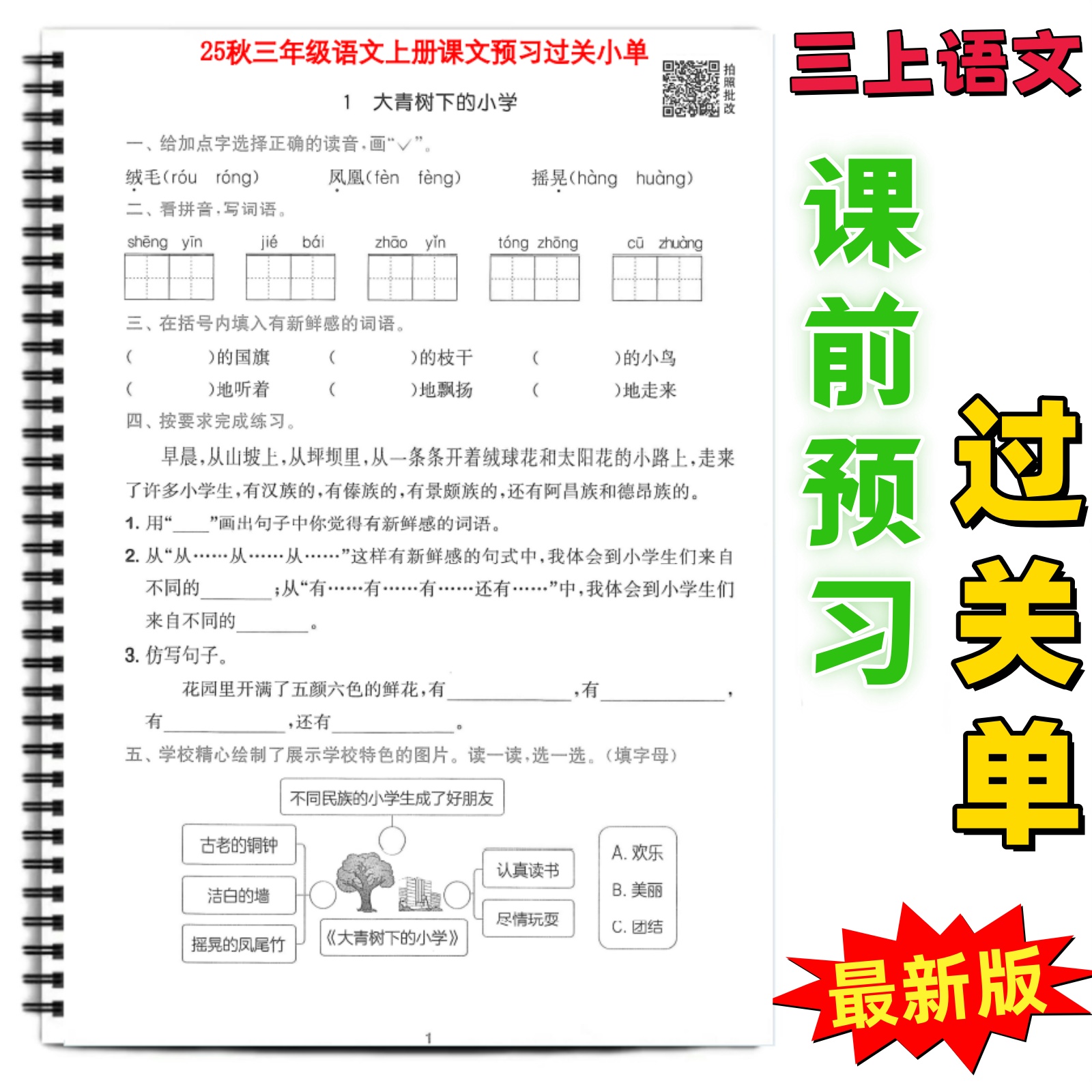 25秋一二三四五六年级语文上册课前预习过关单二年级必备小学全册每课重点老师推荐拼音练习偏旁新版基础组词句子词语