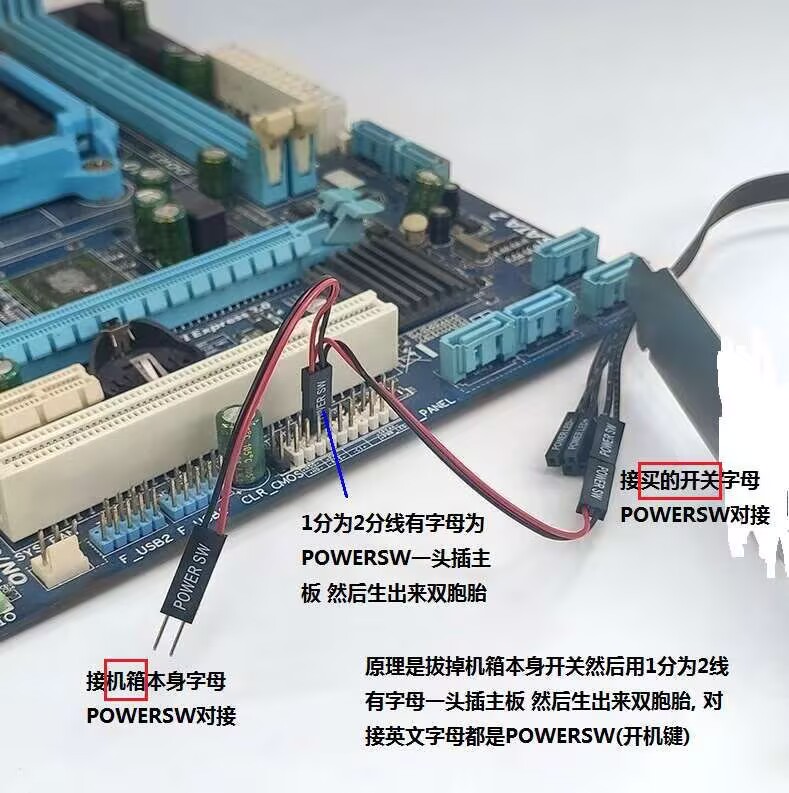 主板电脑开机线一分二机箱桌面开关外接键保留原开机灯光重启功能