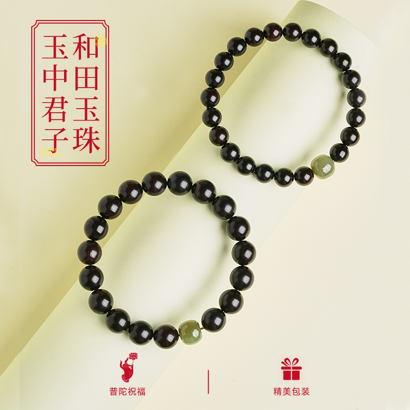 普陀山小叶紫檀佛珠手串男女款天然和田玉转运珠手链木制文玩礼物
