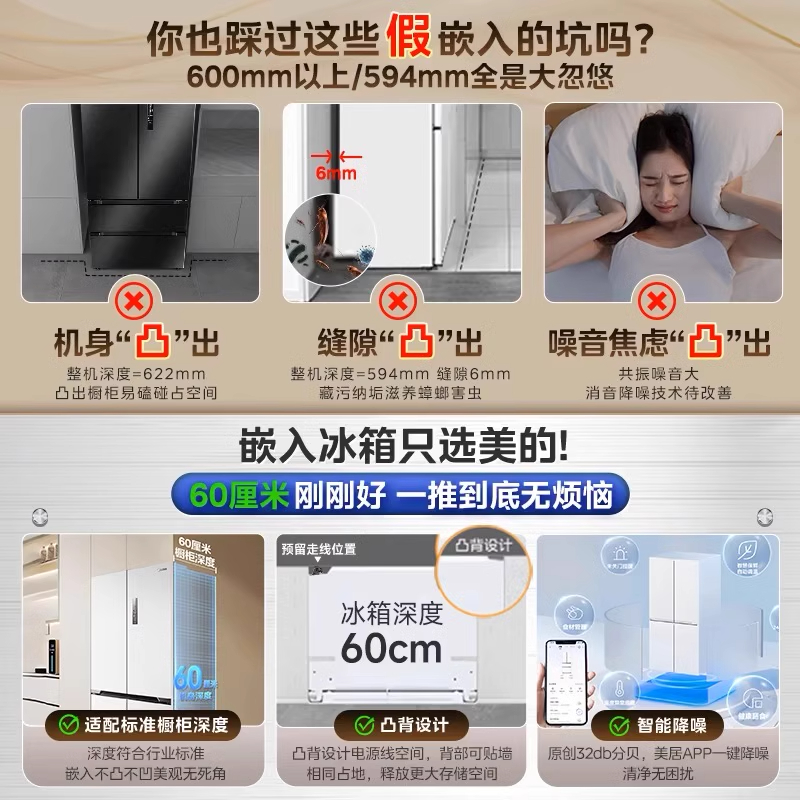美的M60小机皇520超薄零嵌入式冰箱家用双系统法式多门四门双开