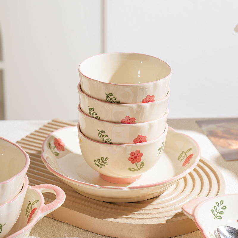 奶油风陶瓷碗家用卡通菜盘子可爱米饭碗汤碗釉下彩儿童餐具耐高温