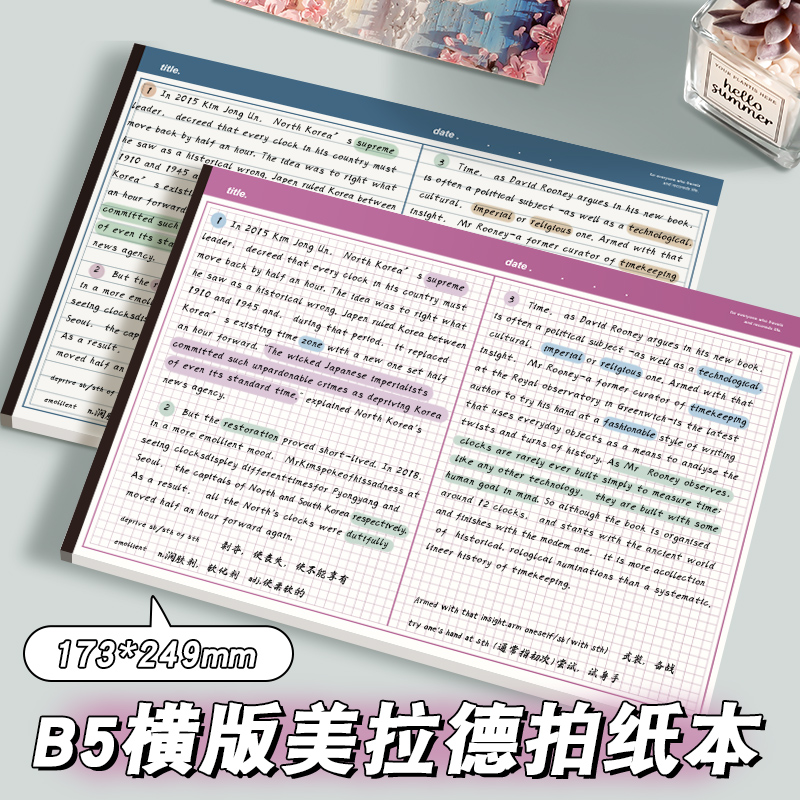 B5撞色横线款拍纸本高颜值大学生考研加厚摘抄笔记本便签本英语背单词本横版上翻可撕方格纸学生演算草稿本