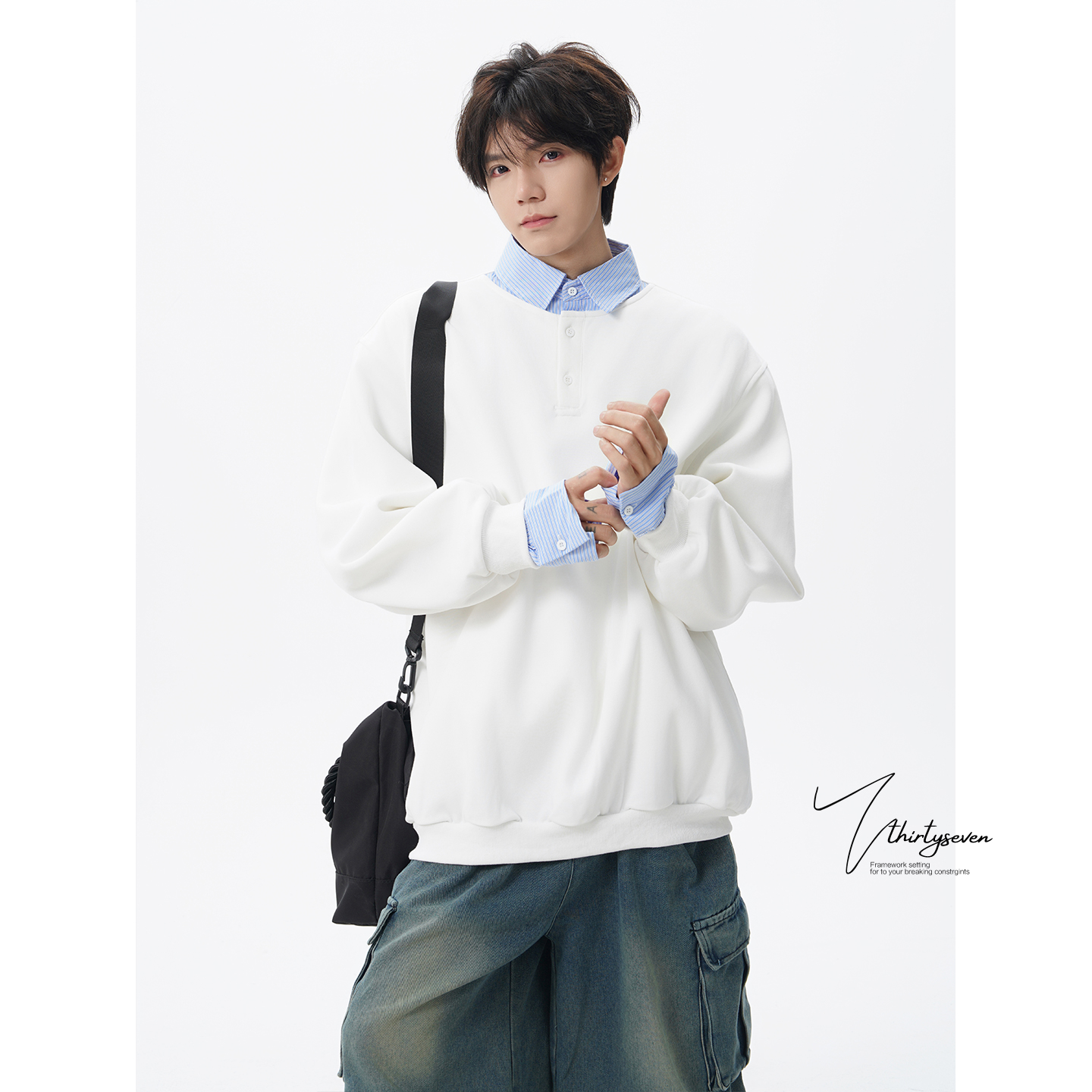 V37美式设计感衬衫领卫衣男秋潮牌青少年长袖上衣宽松假两件外套