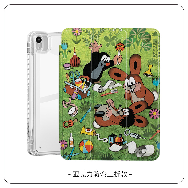 可爱卡通小众三只鼹鼠的故事绿色适用于苹果2024款iPadPro12.9/11三折保护壳air6/air5/mini6防摔气囊平板壳