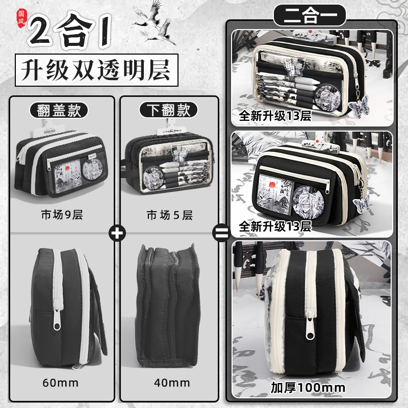 水墨画疏窗~13层大容量笔袋男生2025新款超火高颜值ins男孩款文具盒小学生铅笔盒透明初中女生文具袋套装收纳
