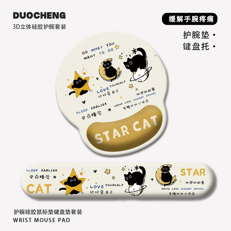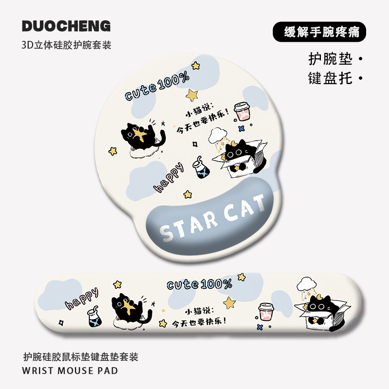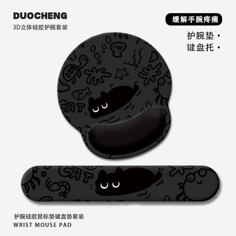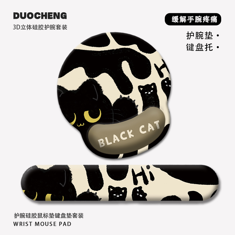 卡通小黑猫护腕鼠标垫键盘手托高颜值电脑垫子桌面护肘硅胶防滑垫